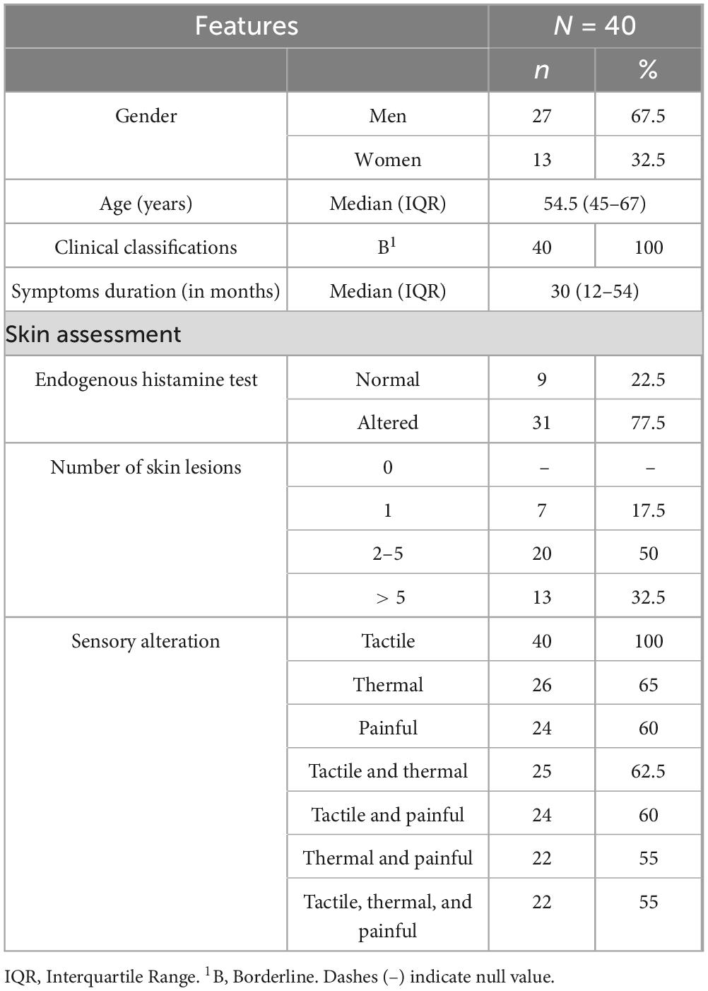 Demographic and clinical data of the individuals prior to treatment initiation are presented in Table 2. Regarding sex distribution, 67.5% of the sample were male, with a median age of 54.5 years. Clinically, all patients (100%) were classified as borderline. The median symptom duration before diagnosis was 30 months. Regarding the endogenous histamine test, 77.5% of patients exhibited altered reactivity, indicating frequent impairment of cutaneous neurovascular responses. In terms of cutaneous involvement, 32.5% of individuals presented with more than five skin lesions at baseline. Concerning sensitivity alterations, 55% of the cohort showed neural signs and symptoms involving pain, light touch, and thermal sensitivity. When analyzed individually, the most prevalent tactile abnormality was loss of light touch (100%), followed by impaired thermal sensation (65%) and pain perception (60%).