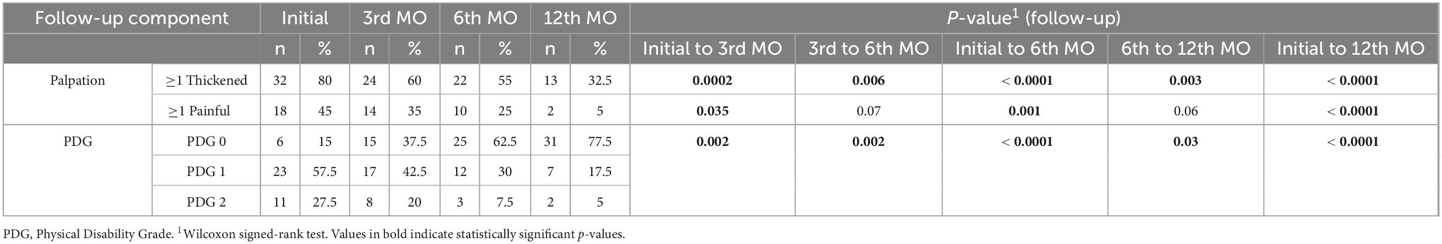 Table 3. Nerve palpation findings and physical disability grade (PDG) at baseline and during treatment follow-up.