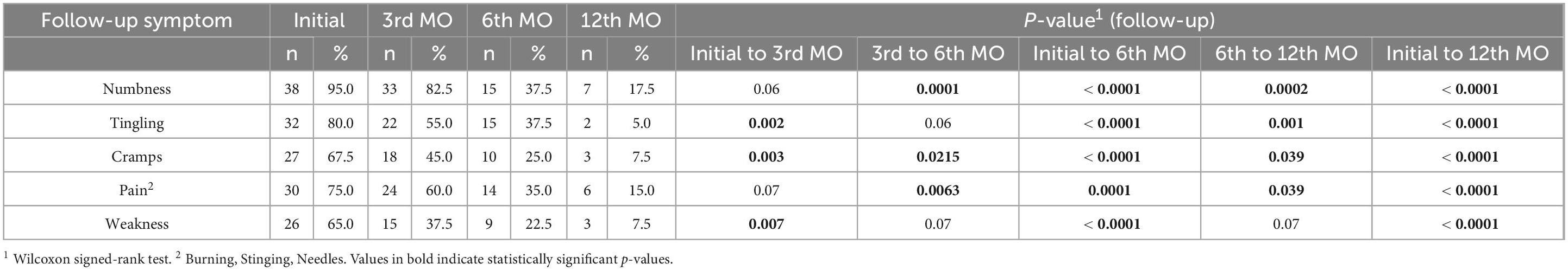 Neurological symptom data collected throughout follow-up are presented in Table 4. A significant reduction in the frequency of tingling was observed, decreasing from 80% at baseline to 55% after 3 months of treatment (p = 0.002). Similarly, muscle cramps decreased from 67.5 to 45% in the same period (p = 0.003), and weakness declined from 65 to 37.5% (p = 0.007). Numbness showed a significant reduction only after 6 months of treatment, decreasing from 95 to 37.5% (p < 0.0001). Pain-related symptoms (e.g., burning, prickling, stinging) also declined significantly, from 75% at baseline to 35% at 6 months (p = 0.0001). Between the 6 and 12th months of treatment, all neurological symptoms continued to improve significantly (p < 0.05), except for muscle weakness, which did not reach statistical significance in this interval (p = 0.07).