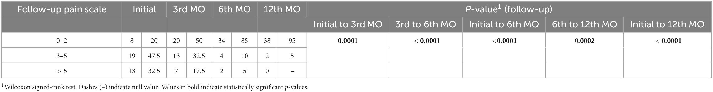 Pain intensity outcomes assessed over time are detailed in Table 5. At baseline, only 20% of patients reported pain scores below 3 on the Numerical Rating Scale (NRS). After 3 months of treatment, this proportion increased significantly to 50% (p = 0.0001). Further improvement was observed at subsequent follow-ups: at 6 months, 85% of patients reported pain scores below 3 (p < 0.0001), and by 12 months, this number reached 95% (p = 0.0002), indicating a consistent and substantial reduction in pain perception throughout the treatment period.