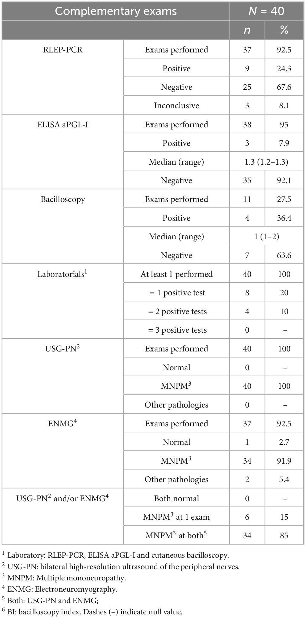 Complementary exams demonstrated limited sensitivity when used individually. Only 30% of patients had positive laboratory test results. ELISA aPGL-I and RLEP-PCR showed positivity rates below 8 and 25%, respectively, while slit-skin smear was positive in 36.4% of the 27.5% of patients tested (43). In contrast, USG-PN and ENMG showed excellent diagnostic performance (100 and 91.9%, respectively), although their accessibility is limited by technical and logistical challenges (21, 34). Lima et al. reported a diagnostic sensitivity of 28.0% for aPGL-I in new HD cases, with 34.6% sensitivity and 96.0% specificity (35). A review of multiple studies found average sensitivities and specificities of 63.8 and 91%, respectively, mainly for MB cases (43). Additionally, qPCR may not detect patients with low bacillary loads and is often restricted to reference centers, limiting its field application (44). USG-PN offers a low-cost, non-invasive means of assessing nerves inaccessible to palpation, while nerve conduction studies yield approximately 88% sensitivity in HD diagnosis (2). A bidirectional review of medical records highlights a limitation in capturing laboratory tests at the time of diagnosis, reflecting the low proportion of individuals tested. Additionally, we found that patients with low bacillary loads but pronounced neurological signs and symptoms tend to show low seropositivity, especially in regions with lower endemicity.