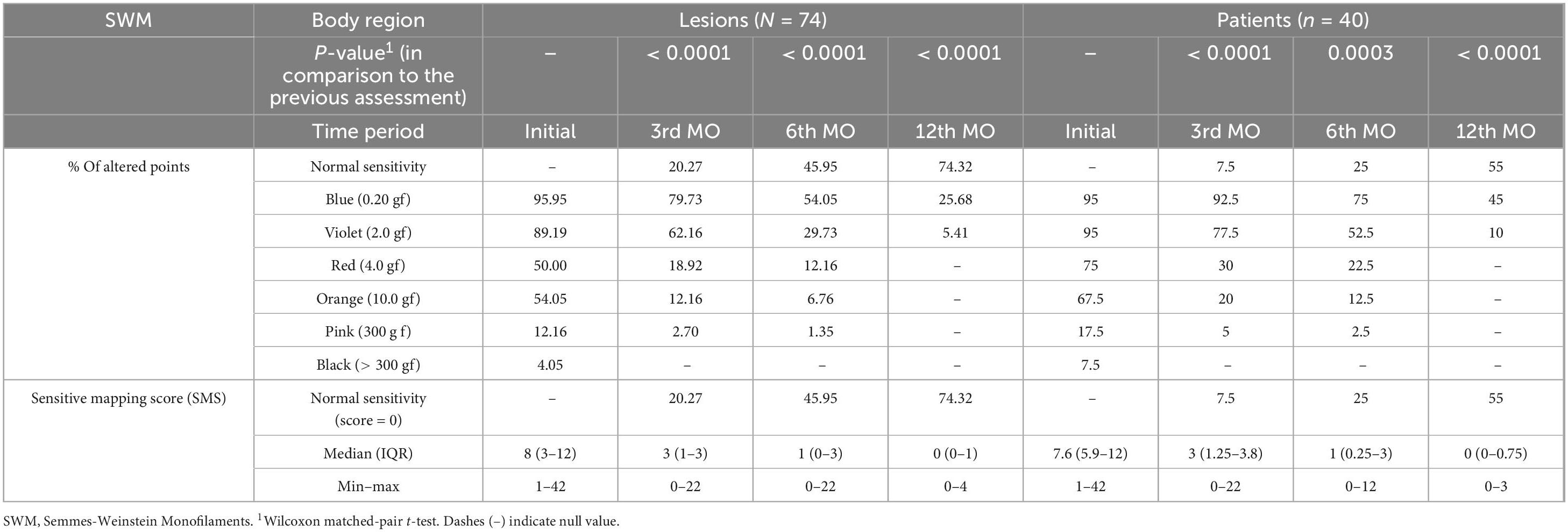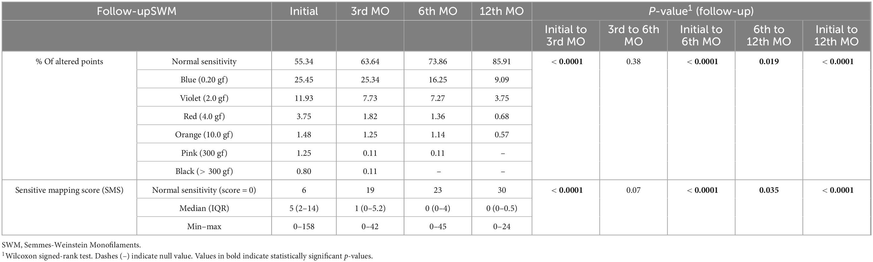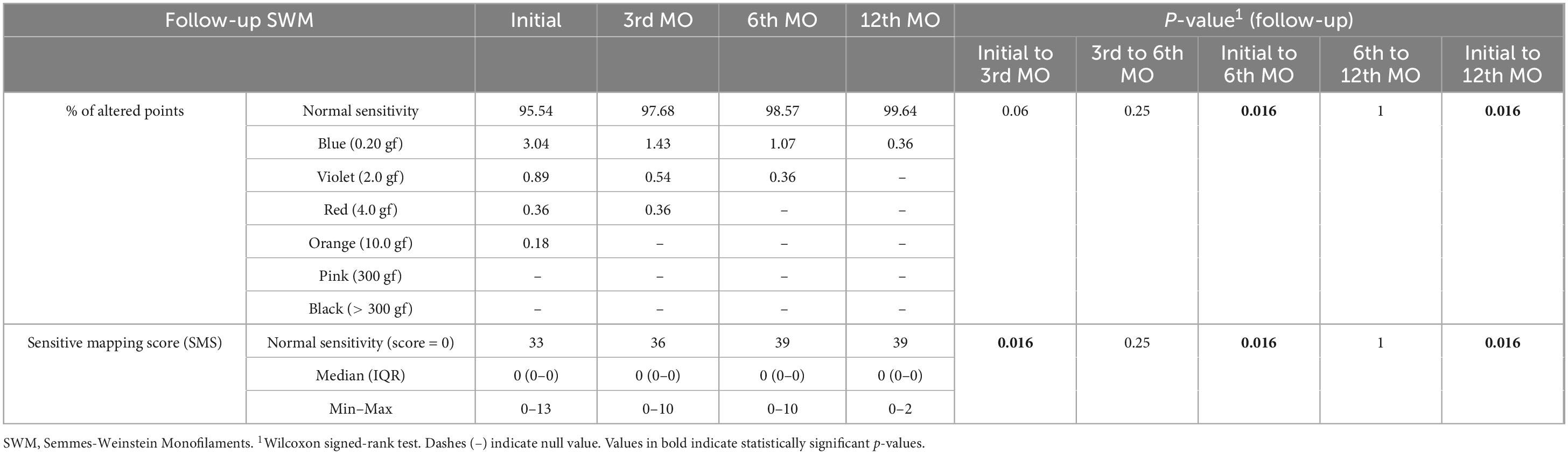 All data were compiled using Microsoft Excel 2023 and subsequently analyzed with GraphPad Prism version 10.0 (GraphPad Inc., La Jolla, CA, United States). For comparisons of tactile sensitivity responses across different time points during patient follow-up, the non-parametric Wilcoxon matched-pairs signed-rank test was applied. Correlations among continuous or ordinal variables were assessed using Spearman’s rank correlation coefficient (ρ – rho). The strength of correlations was classified as absent (< 0.3), weak (approximately 0.3–0.5), moderate (0.5–0.7), or strong (> 0.7), according to established methodological guidelines (36). Continuous variables were described using medians and interquartile ranges (IQR), while categorical variables were presented as absolute frequencies and percentages. The significance level was set at 95% (alpha = 0.05), with p-values considered significant when ≤0.05. Results were expressed with corresponding 95% confidence intervals (95% CI). For contingency analyses involving dichotomous categorical variables (e.g., presence or absence of sensory perception by color threshold), Fisher’s exact test was used when expected frequencies were low. The analysis framework was designed to assess intra-individual changes over time in a paired manner, reinforcing sensitivity score progression as a longitudinal clinical endpoint.