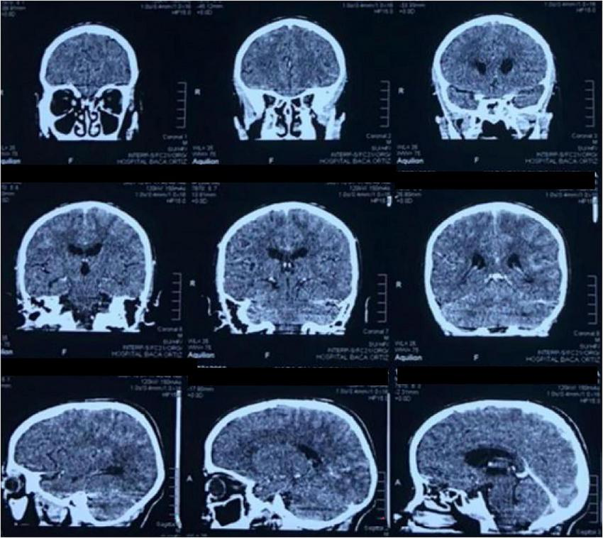 CT scan of the brain in coronal and sagittal planes shows a ventricular system with preserved morphology. No meningeal enhancement is observed.