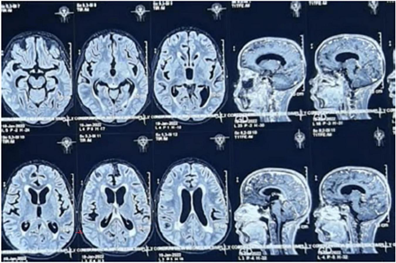 In the following weeks at home, his clinical condition deteriorated, with anxiety episodes, worsening and altered seizure patterns, recurrent fever, more intense holocranial headaches, and photophobia. He was readmitted for hospitalization; brain magnetic resonance imaging (MRI) during this admission revealed ventricular dilation and patchy hyperintensities in the periventricular white matter, without signs of cerebrospinal fluid flow obstruction findings consistent with intracranial hypertension (Figure 2).