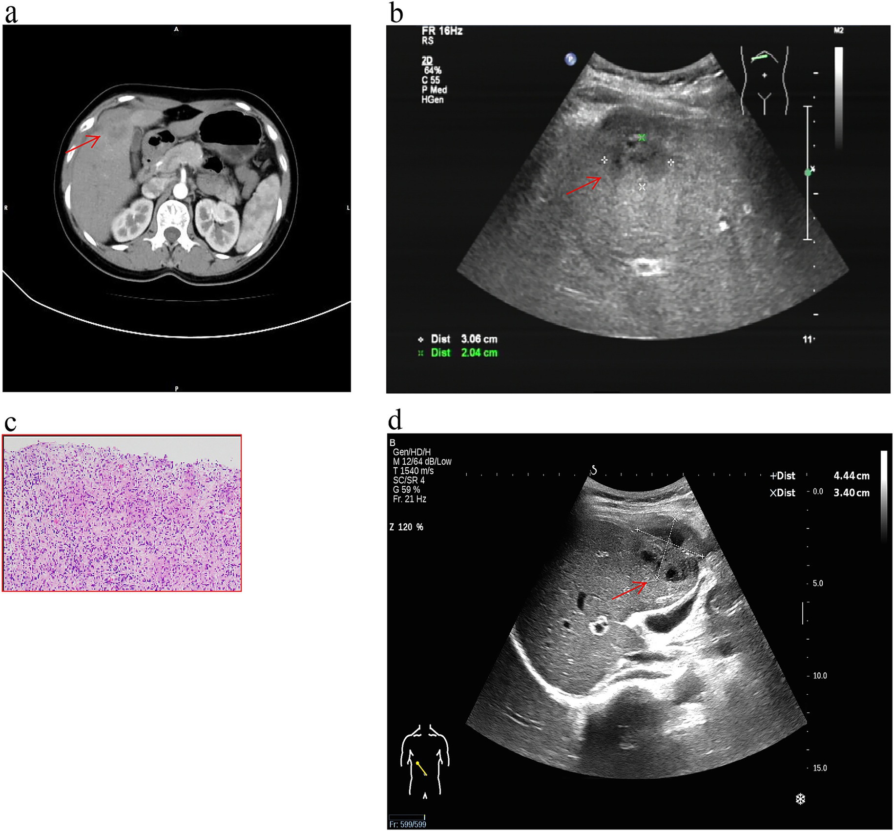 Figure 1. Rare case of tuberculosis liver abscess. (a) The abdominal hepatic CT scan revealed a single, well-defined focal lesion measuring 0.8 cm in the low-density area of the right liver lobe and an irregular mass measuring approximately 4.1 cm × 3.1 cm in the right anterior space of the liver (red arrow). (b) Ultrasound of the abdomen showed a cystic dark area of 3.7 cm × 2.1 cm in the right posterior lobe of the liver (red arrow). (c) Hematoxylin–eosin staining shows chronic granulomatous inflammation suggestive of tuberculosis (HE ×200). (d) The abdominal ultrasound reveals a noteworthy enlargement of the abscess, measuring 4.4 cm × 3.4 cm (red arrow).