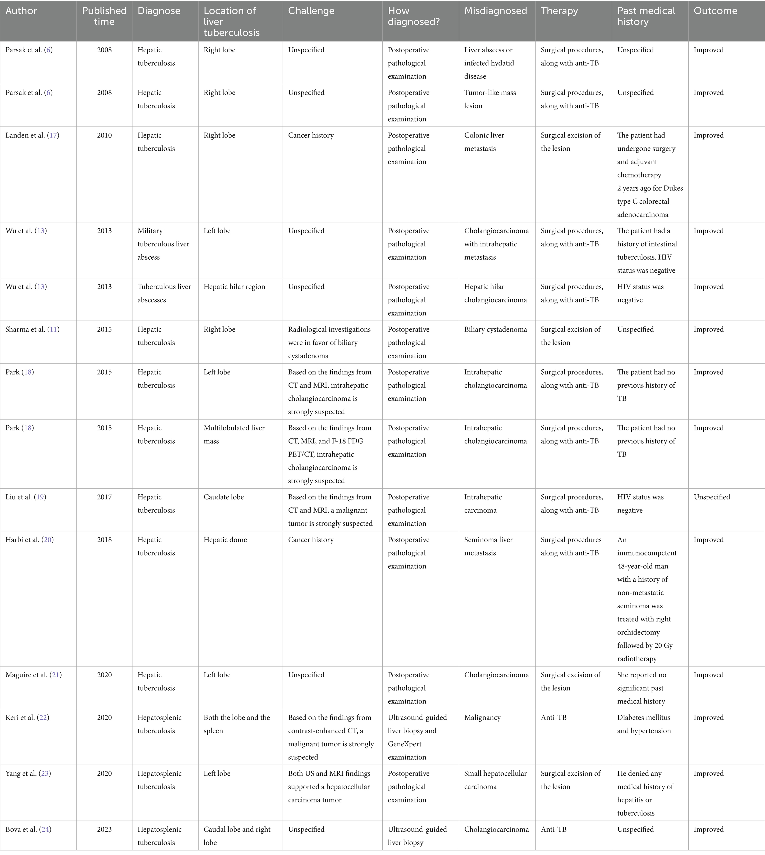 13. Wu, Z, Wang, W-L, Zhu, Y, Cheng, J-W, Dong, J, Li, M-X, et al. Diagnosis and treatment of hepatic tuberculosis: report of five cases and review of literature. Int J Clin Exp Med. (2013) 6:845–50. doi: 10.1155/2013/384894