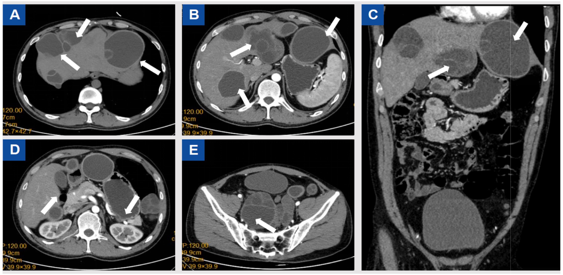 The patient had a clear epidemiological history of exposure to livestock, including cattle, horses, and sheepdogs. He denied any history of chronic disease, drug allergy, psychiatric illness, or hereditary disorders, and no family members had similar hydatid disease. He was hospitalized after a CT scan performed at an outside hospital revealed multiple intra-abdominal lesions 9 days before admission.