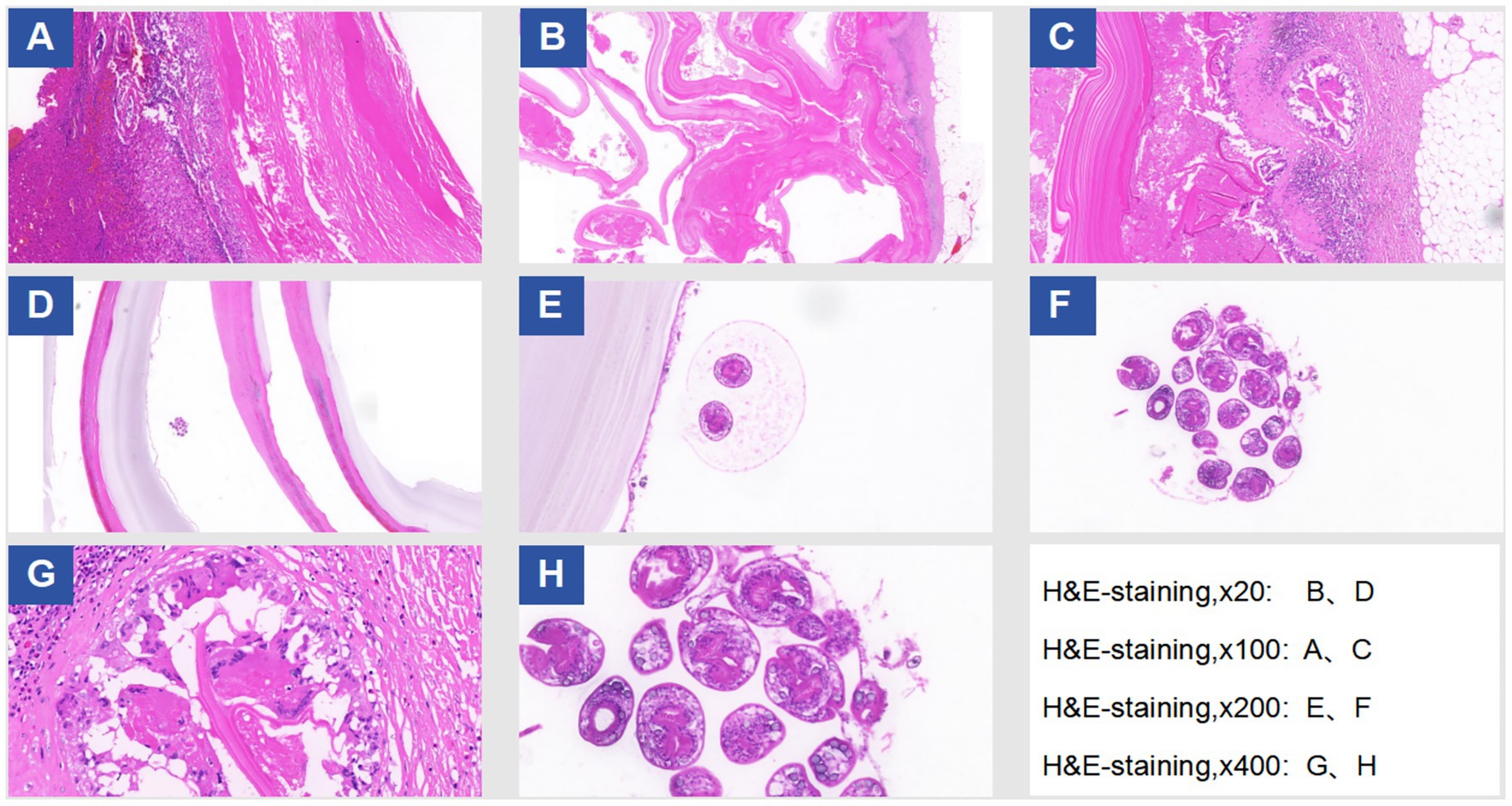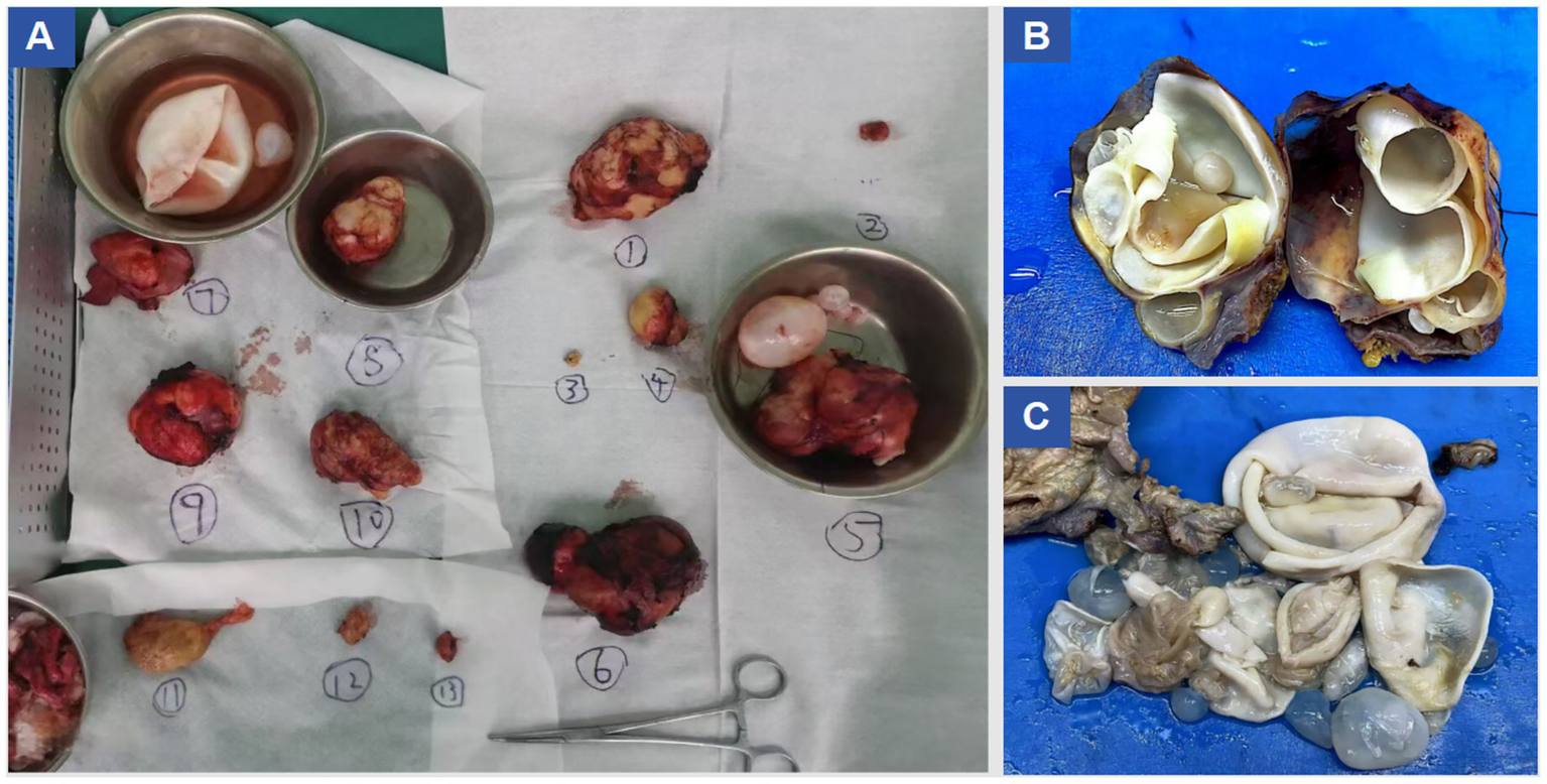 Under general anesthesia, a midline T-shaped laparotomy extending from the xiphoid process to the pubic symphysis was performed. Extensive adhesions involving the intestines, greater omentum, and abdominal wall were carefully lysed. Multiple cystic echinococcosis lesions were identified from the subdiaphragmatic space down to the pelvic cavity. To reduce intracystic tension, decompression was first conducted using a fine-gauge needle, followed by meticulous dissection along the cleavage planes between the cysts and surrounding tissues. An approximately 10 cm cyst located anterior to the stomach, together with the greater omentum, was excised while preserving the gastric wall. A roughly 4 cm lesion in the left lower abdominal wall extending into the left iliac fossa and the sigmoid mesentery was removed, and the compressed left ureter was released to restore patency. A large cyst (approximately 9.5 × 7.5 cm) situated in Couinaud segment VIII of the right hepatic lobe and protruding into the diaphragmatic dome was resected; the involved portion of the diaphragm was excised, and a partial tear of the inferior vena cava was repaired. A 9 × 6 cm cyst in the left hepatic lobe involving the pericardium was resected, followed by closure of the diaphragmatic defect. A fused lesion (approximately 10 × 6 cm) involving hepatic segments III and IV b was removed en bloc. Pelvic cysts adherent to the intestines and vas deferens were sharply dissected, with the vas deferens transected and reconstructed via end-to-end vasovasostomy. The Pringle maneuver was intermittently applied to control hepatic inflow. Estimated intraoperative blood loss was approximately 2,800 mL, and hemodynamic stability was maintained using transfusion of packed red blood cells and fresh frozen plasma. Multiple drains, including hepatic cut-surface drains, left and right subdiaphragmatic drains, pelvic drains, a drain at the foramen of Winslow, intraperitoneal drains, and a right-sided closed thoracic drainage tube—were placed to evacuate blood, fluid, and air and to monitor for postoperative complications such as hemorrhage, bile leakage, or pneumothorax. Instrument and sponge counts were confirmed correct, and the abdominal wall was closed in layers. The patient was then transferred to the intensive care unit for monitoring. A total of at least 13 lesions were completely resected during surgery, as shown in Figure 2. A summary of the surgical resection and repair procedures is provided in Table 1. Postoperative pathological examination confirmed the diagnosis of echinococcosis, as shown in Figure 3.