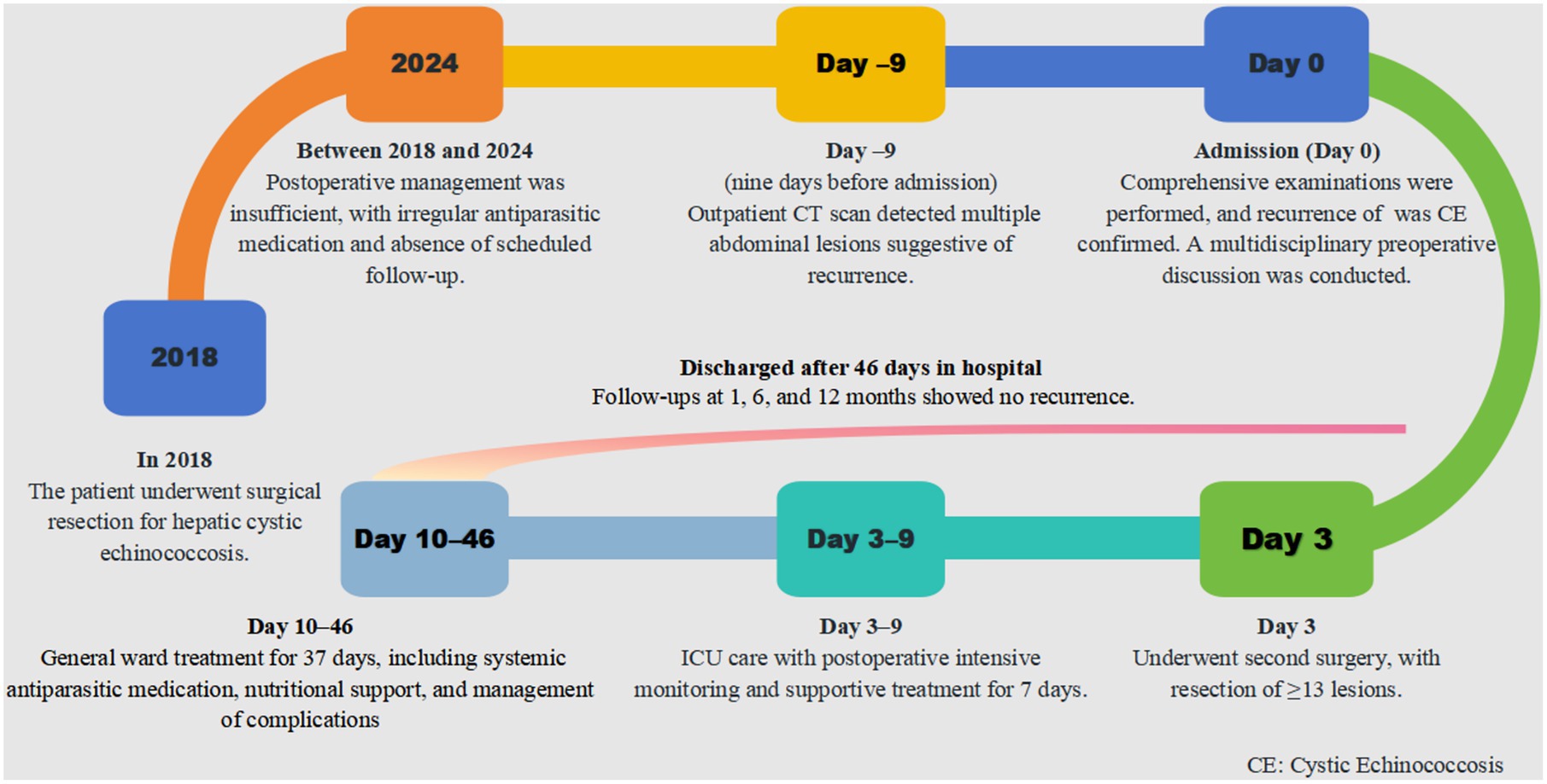 Postoperatively, the patient remained in the ICU for 7 days of intensive monitoring before transfer to the general ward for continued care. The total hospital stay was 46 days. Upon discharge, the patient commenced albendazole therapy and was followed up at 1, 6, and 12 months postoperatively, with no evidence of recurrence. The patient demonstrated good medication adherence, tolerated therapy well, and reported no significant adverse effects. Long-term follow-up continues, and a timeline of the patient’s treatment course is shown in Figure 4.