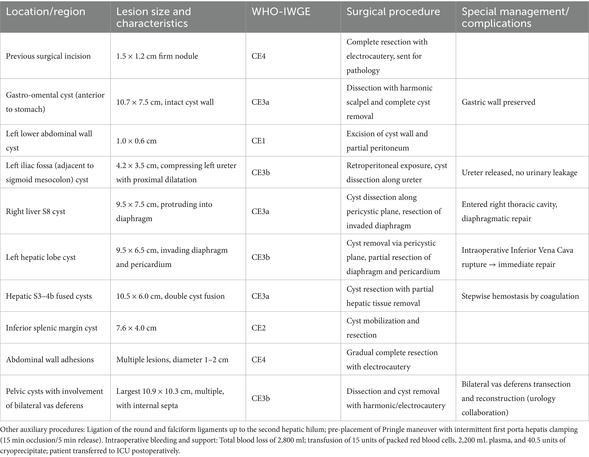 Case presentation: We report a 29-year-old Tibetan male who presented with progressive abdominal pain, distension, and a 15-kg weight loss over 6 months. He had undergone hepatic CE cystectomy 5 years earlier but did not receive regular albendazole therapy or follow-up. Imaging revealed multiple cystic lesions in the liver, spleen, greater omentum, and pelvic cavity. More than 13 lesions, including hepatic and diaphragmatic lesions, were excised during surgery, with concurrent management of vascular and urinary tract involvement. Intraoperative blood loss was approximately 2,800 mL, which required transfusion support and intensive care monitoring.