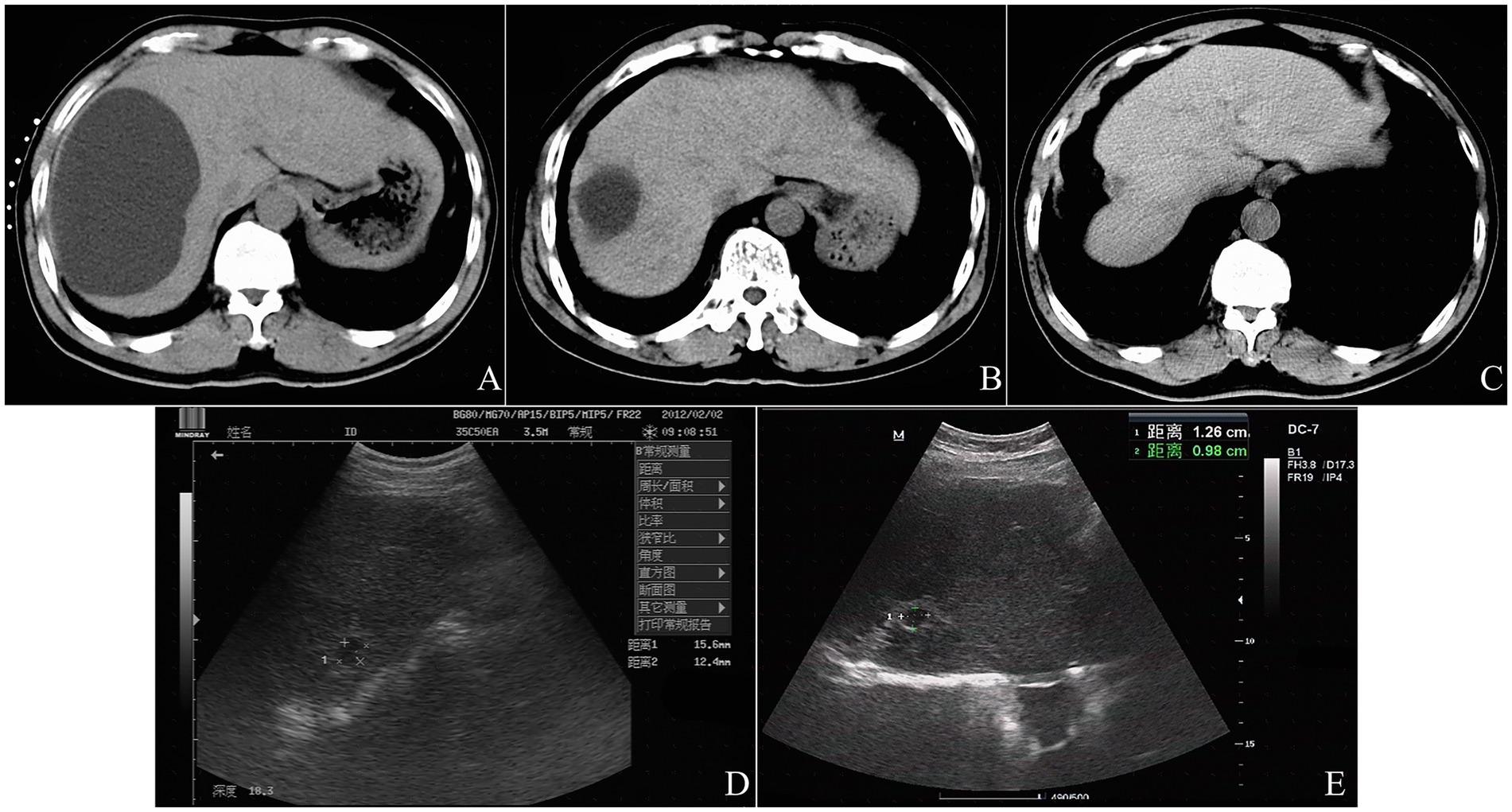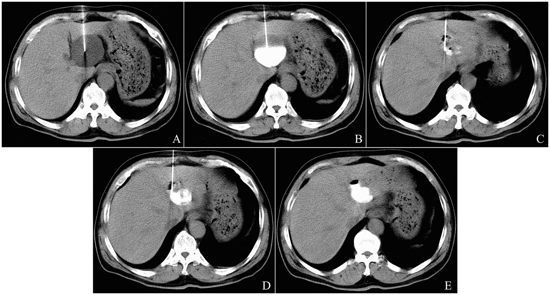 Figure 1. The single-pass single-needle puncturing technique of CT-guided percutaneous needle aspiration and bleomycin sclerotherapy for a 67-year-old male patient with solitary hepatic cyst. A 10-cm 21-gage Chiba needle was inserted into the cyst in the left liver lobe under CT guidance (A). After the first 10 mL of aspirated cyst fluid was sent to the laboratory for examination, 10 mL of diluted contrast media was injected into the cyst to confirm that there was no communication between the cyst and the biliary system (B). The cyst fluid was then evacuated almost completely (C). The repeat CT scan showed no leakage after injection of the half-dose Bleomycin solution contained diluted contrast media (D). The postprocedure CT scan showed that bleomycin solution was stayed in the cyst cavity (E).