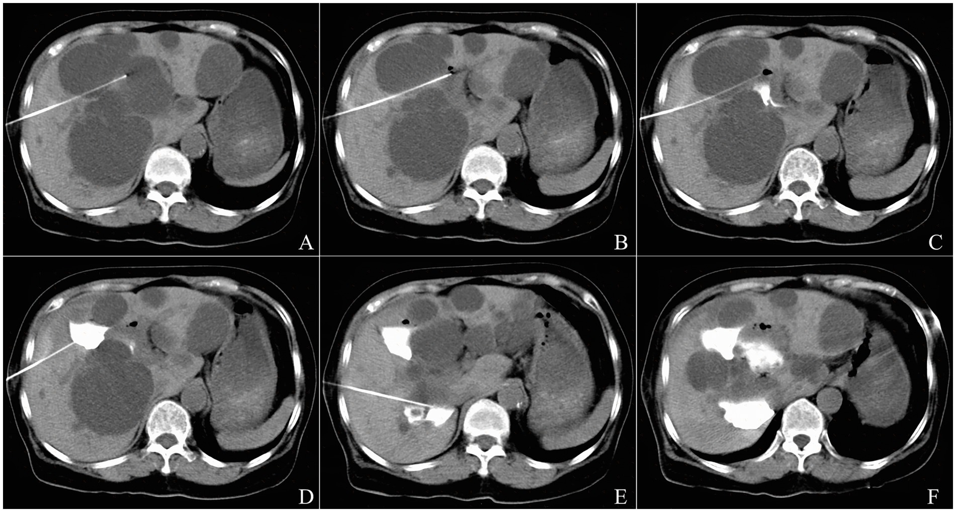 Figure 2. The single-point multi-angulated puncturing technique of CT-guided percutaneous needle aspiration and bleomycin sclerotherapy for three cysts in a 70-year-old female patient with polycystic liver disease. A 15-cm 21-gage Chiba needle was inserted toward the ventral orientation from the right midaxillary line, and went through the cyst located in the lateral section of liver segment V and entered into the cyst located in the medial section of liver segment V (A). The cyst located in the medial section of liver segment V was evacuated completely (B), and bleomycin solution contained diluted contrast media was injected into the cyst cavity without evidence of leakage (C). The needle was then withdrawn into the cyst located in the lateral section of liver segment V, the procedure of aspiration and sclerotherapy was repeated (D). Next, the needle was drawn back to the subcutaneous layer, and than was inserted toward the dorsal orientation from the right midaxillary line and entered into the cyst located in liver segment VI; the procedure of aspiration and sclerotherapy was performed (E). The postprocedure CT scan revealed that bleomycin solution remained behind in three cysts without evidence of spillage (F).