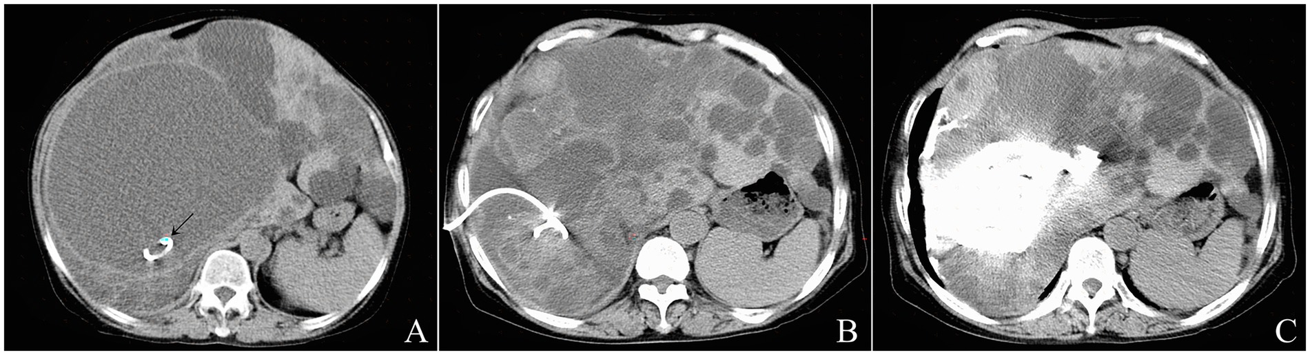 Large solitary cysts were punctured directly using a 21-gage Chiba Needle (Cook Medical LLC, Bloomington, United States) with a single-pass along the planned trajectory (Figure 1A). After confirming the correct needle position within the cyst cavity via a controlling CT scan, the needle core is removed, and 10 mL of the cyst content was aspirated for laboratory analysis. Next, 10 mL of undiluted iodinated contrast medium (Iohexol 300 mgI/mL, GE Healthcare, Shanghai, China) was injected into the cyst to ensure no communication between the cyst cavity and the biliary system, and no leakage into the peritoneal cavity (Figure 1B). The remaining cyst fluid with the contrast medium was then aspirated as completely as possible (Figure 1C). The total volume of the aspirated fluid was recorded. Subsequently, bleomycin hydrochloride (Takasaki Plant, Nippon Kayaku Co., Ltd., Tokyo, Japan) was dissolved in diluted contrast medium (1:1 mixture by volume of contrast medium and normal saline solution) at a total dose of 5 mg bleomycin per 100 mL cyst fluid, not to exceed 0.6–0.8 mg/kg body weight per patient. The amount of diluted contrast medium was equivalent to 5–10% of the aspirated fluid volume, not exceeding 10 mL. Bleomycin solution was injected into the aspirated cyst, and remained in the cyst cavity without extraction (Figure 1D). Finally, the needle was removed, and a postprocedure CT scan was performed to rule out leakage from the cyst and possible complications (Figure 1E).