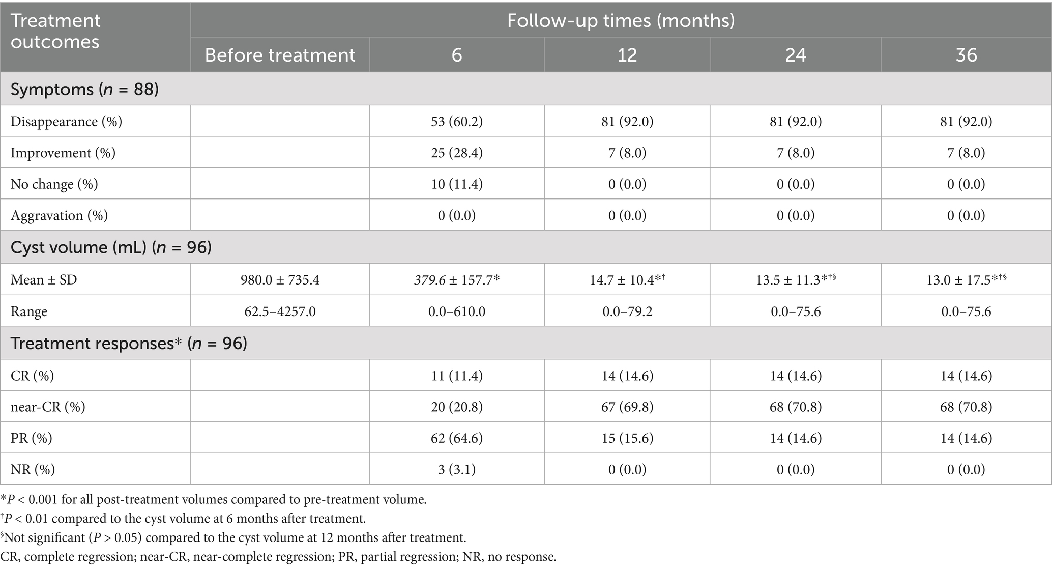 The cyst volume was estimated according to the orthogonal diameter of the cyst obtained from ultrasound, CT or MRI examinations. The volume reduction rate (VRR) is calculated as follows: VRR = (initial volume − final volume)/initial volume × 100% after treatment. The treatment responses were classified into four categories as follows: complete regression (CR; ie, invisible or immeasurable), near-CR (ie, VRR > 85%), partial regression (PR; ie, VRR of 50–85%), and no response (NR; ie, VRR < 50%). The overall response rate was defined as the percentage of patients in whom CR, near-CR, or PR were achieved (11).