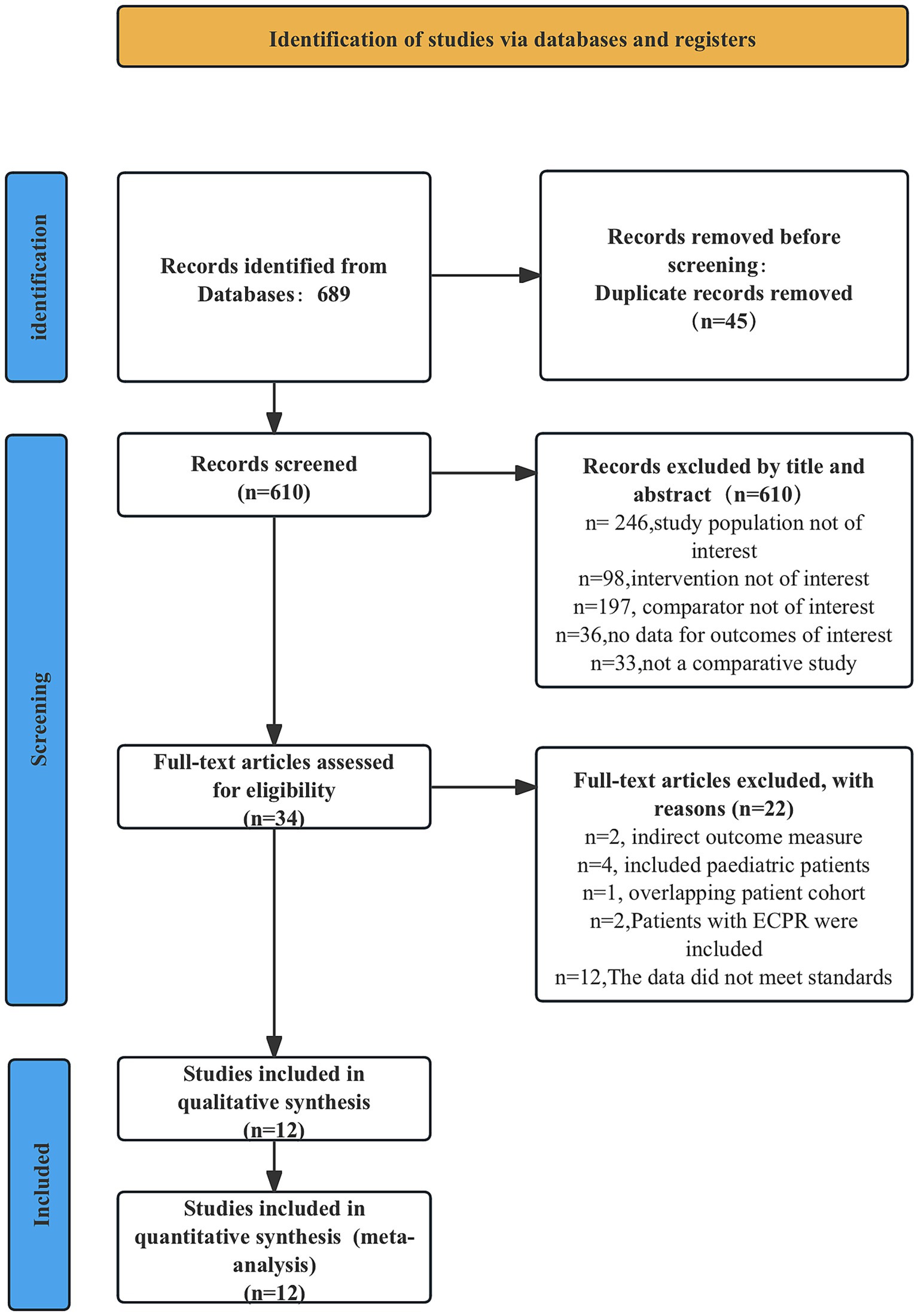 Upon database searching, we identified a total of 689 records. Before reading, we removed 45 duplicate records, and based on the titles and abstracts of the articles, 610 were excluded. We carefully reviewed the remaining 34 articles and selected 12that met the inclusion criteria, including 3 RCTs (3, 8, 9) and 9 observational studies (3, 5, 10–16). Figure 1 shows the entire article screening process.