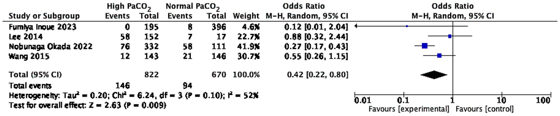 Results: Twelve studies were included. Compared with normocapnia, hypercapnia was associated with lower in-hospital mortality (pooled OR 0.74, 95% CI 0.59–0.92). For neurological outcomes, hypercapnia was associated with less short favorable outcome (pooled OR 0.42, 95% CI 0.22–0.8).