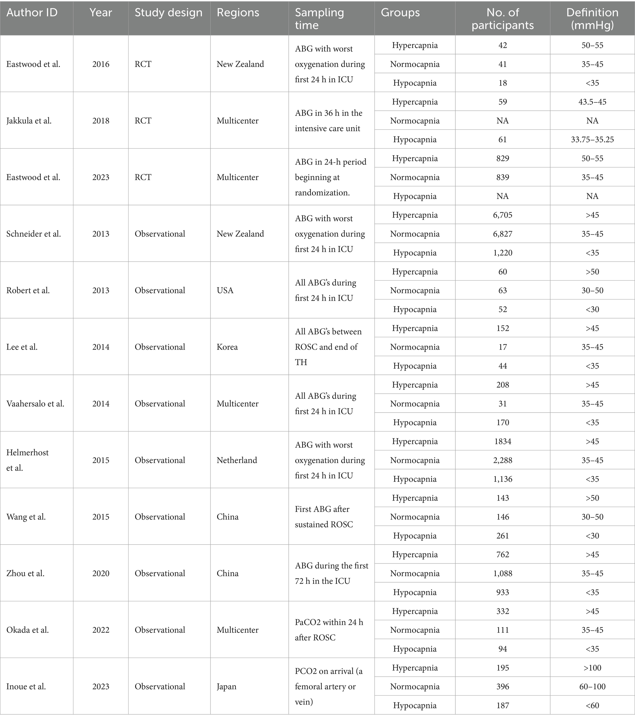 Among the 12 included studies, 11 reported arterial PaCO2 directly from arterial blood gas analysis, whereas 1 studies used surrogate measures. Specifically, 1 reported venous or unspecified PCO2 values on admission.