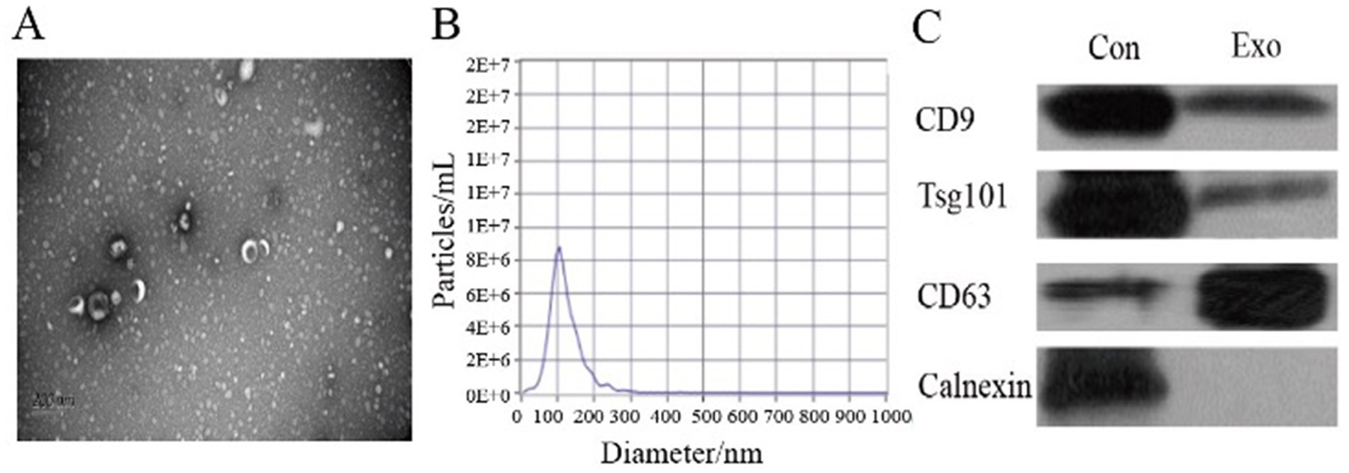 Figure 1. Identification of plasma exosomes in advanced lung cancer patients. (A) Transmission electron microscopy revealing the structure of the plasma exosomes isolated from patients. (B) Particle size measurement of the identified plasma exosomes. (C) Western blot analysis illustrating the detection results of plasma exosome components. Con: positive control; Exo: the patient’s plasma exosomes.