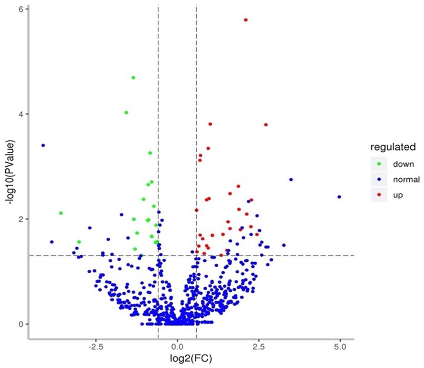 Figure 2. Differential expression of miRNAs in plasma exosomes of advanced lung cancer patients. Each data point denotes a specific miRNA; red points indicate upregulated miRNAs, green points indicate downregulated miRNAs, and blue points signify miRNAs with undifferentiated expression.