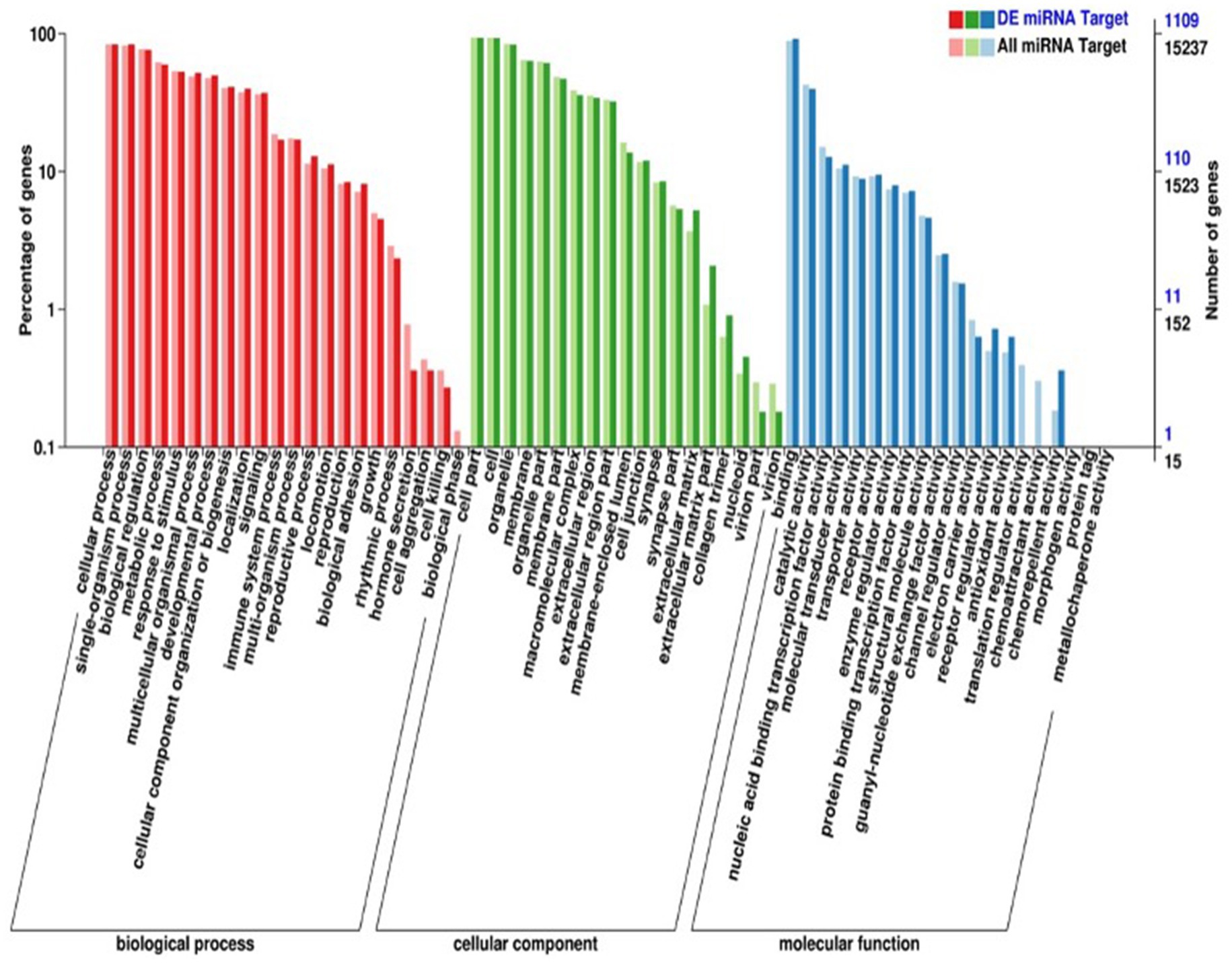 Figure 3. GO annotation classification of differentially expressed miRNA target genes in plasma exosomes. The horizontal axis delineates the categories listed in the GO database, whereas the vertical axis depicts the proportion and total number of genes classified in each category. The target gene functions of differentially expressed miRNAs were related to the extracellular matrix, collagen trimer, and nucleoid.