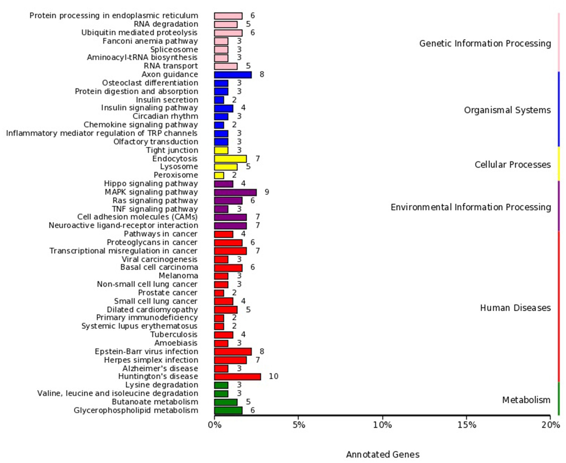 The vertical axis lists the various KEGG pathways, and the horizontal axis indicates the number and percentage of genes annotated within each pathway. Pink represents genetic information processing, blue represents organismal systems, yellow represents cellular processes, purple represents environmental information processing, red represents human diseases, and green represents metabolism. The target genes were linked to protein processing in the endoplasmic reticulum, ubiquitin-mediated proteolysis, RNA transport, and the regulation of cell adhesion and endocytosis.