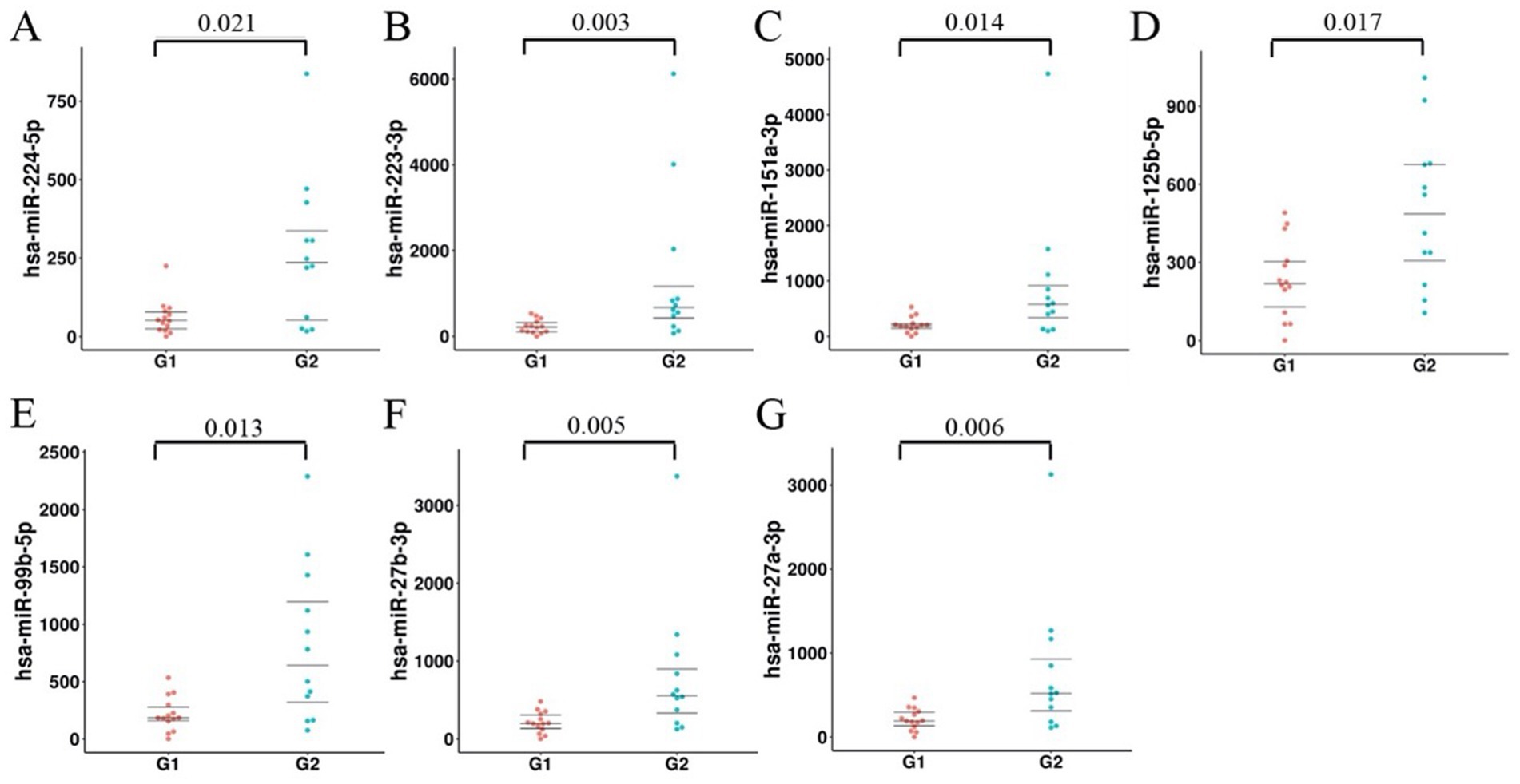 Figure 6. RT-qPCR analysis of differentially expressed miRNAs in plasma exosomes. The values on the vertical axis are all miRNA expression levels (2−ΔΔCT). G1 encapsulates the miRNA expression profile in plasma exosomes from patients without brain metastasis, and G2 embodies that from patients with brain metastasis. The expression magnitudes of 7 differentially expressed miRNAs were notably up-regulated in plasma exosomes of lung cancer patients with brain metastases. The orange dots represent the expression level of miRNA in plasma exosomes from patients without brain metastases, while the green dots represent the expression level of miRNA in plasma exosomes from patients with brain metastases.