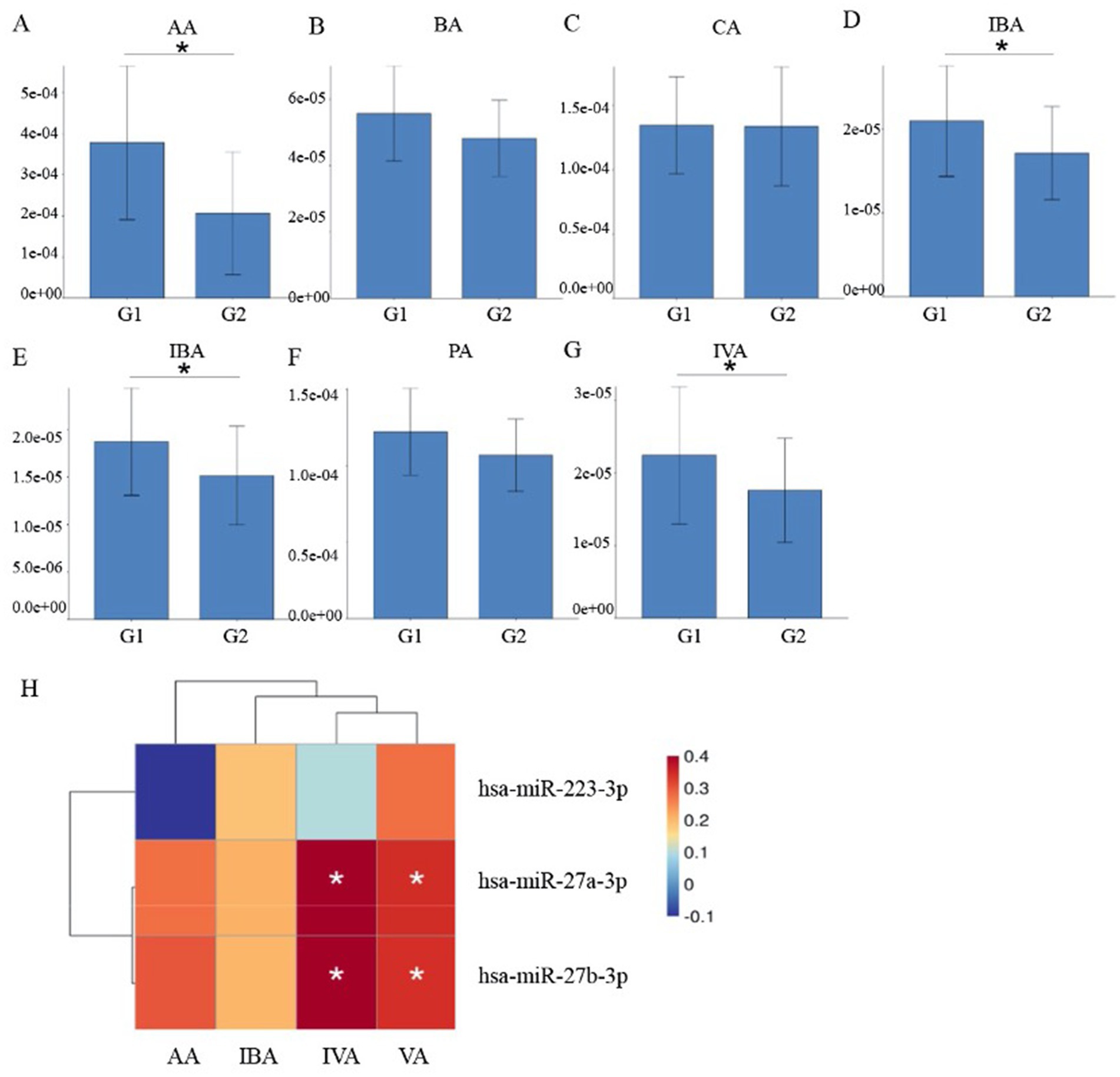 Figure 7. Metabonomic analysis of short-chain fatty acids in plasma exosomes. (A–G) Concentrations of various short-chain fatty acids, including acetic acid (AA), butyric acid (BA), caproic acid (CA), isobutyric acid (IBA), isovaleric acid (IVA), propionic acid (PA), and valeric acid (VA). (H) Spearman correlation analysis elucidating the relationships between differentially expressed short-chain fatty acids and miRNAs. It revealed that both miR-27a-3p and miR-27b-3p had significant associations with IVA and VA.