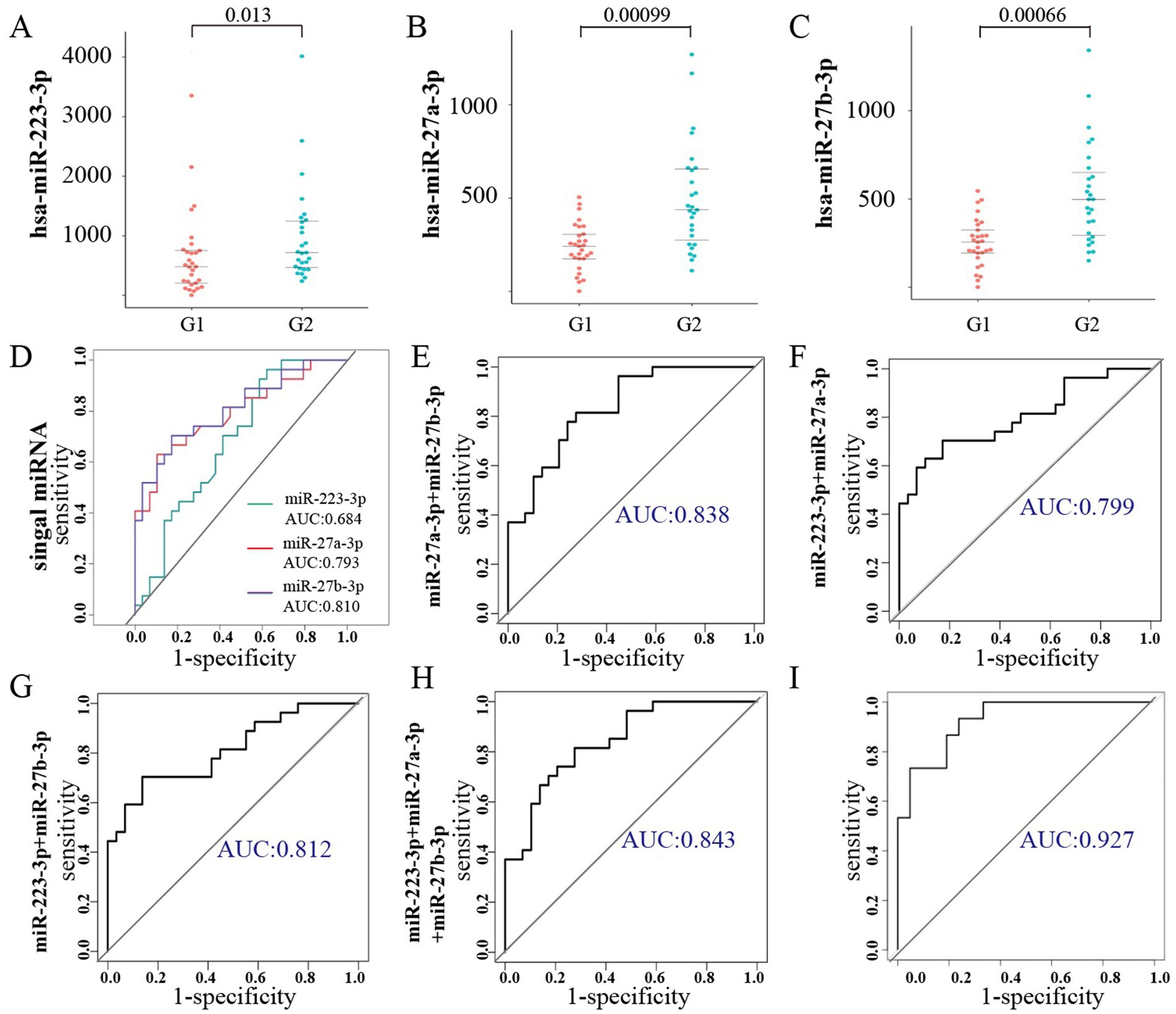 Figure 8. Verification of the diagnostic performance of exosomal miRNAs as biomarkers for lung cancer brain metastasis. (A–C) RT-qPCR analysis of miR-223-3p, miR-27a-3p, and miR-27b-3p in patients’ plasma exosomes. (D–H) Area under the curve (AUC) values illustrating the diagnostic performance of individual and combined miRNAs as potential biomarkers. (D) Calculate the AUC values for miR-223-3p, miR-27a-3p, and miR-27b-3p, respectively. (E–G) The pairwise combinatorial analysis was performed on these three miRNAs. (H) When all three miRNAs were analyzed together, the AUC reached its peak value. (I) Area under the curve (AUC) values of the multi-biomarker model by combining the exosomal miRNAs with metabolic molecules.