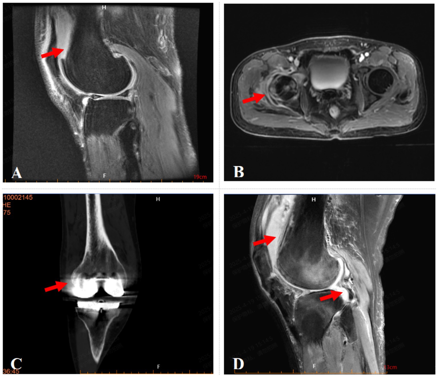Figure 1. Imaging of the affected joints in four patients. (A) Fat-suppressed MRI image of case 1 shows anterolateral subcutaneous edema and suprapatellar bursal effusion. (B) Contrast-enhanced MRI image of case 2 demonstrates abnormal signal intensity with restricted diffusion and enhancement in the periaritcular soft tissues of the right hip, suggestive of inflammation with abscess formation. (C) CT image of case 3 shows Knee Prosthesis and swelling of the periarticular soft tissues. (D) Fat-suppressed MRI image of case 4 shows joint effusion and suprapatellar bursal fluid with periarticular soft tissue edema.