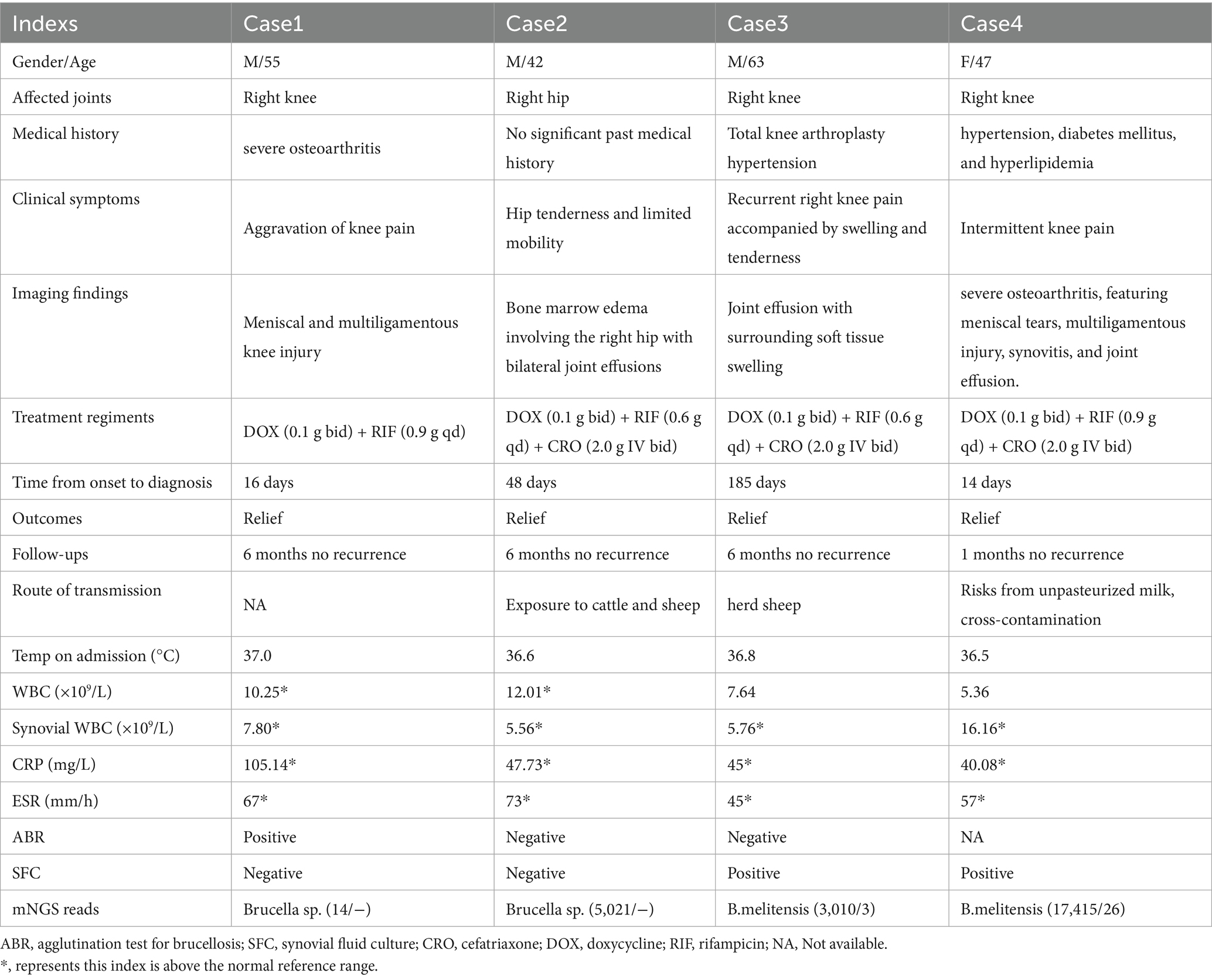 Brucellosis is a zoonotic infectious disease caused by Brucella (primarily Brucella melitensis, Brucella abortus and Brucella suis), which is widely prevalent globally and poses a significant public health threat, especially in regions with developed animal husbandry. Conservative estimates indicate approximately 2.1 million new cases annually worldwide, with particularly severe impacts in Africa and Asia (1, 2). The disease manifests not only through prolonged fever, fatigue, and multi-system dysfunction in patients but also exerts significant socio-economic consequences due to workforce depletion and substantial healthcare expenditures. Among the diverse complications associated with Brucella infection, osteoarticular manifestations are particularly prevalent, occurring in approximately 2–77% of cases, with spondylitis and infections of the hip and knee joints representing the most frequently observed presentations. Affected individuals commonly exhibit clinical features such as joint swelling, pain, restricted range of motion, and systemic manifestations including undulant fever and profuse sweating (3, 4). Conventional etiological diagnostic approaches, including serological assays and bacterial culture techniques, demonstrate limited sensitivity and necessitate extended processing durations, yielding pathogen detection rates below 30% in cases of joint infections. This diagnostic inefficiency contributes to therapeutic delays, potentiates the risk of articular tissue destruction, and consequently elevates both patient disability rates and healthcare expenditures (5). The utilization of mNGS technology in pathogen identification has garnered increasing attention in recent years, owing to its high-throughput capacity, rapid turnaround time, enhanced accuracy, and ability to simultaneously detect multiple pathogens within clinical specimens, thereby providing robust support for diagnostic decision-making. This study represents the first systematic retrospective analysis of four cases of joint Brucella infection diagnosed with mNGS assistance, demonstrating that mNGS serves as a critical diagnostic tool for joint Brucella infection and offers a valuable supplementary approach for culture-negative cases.