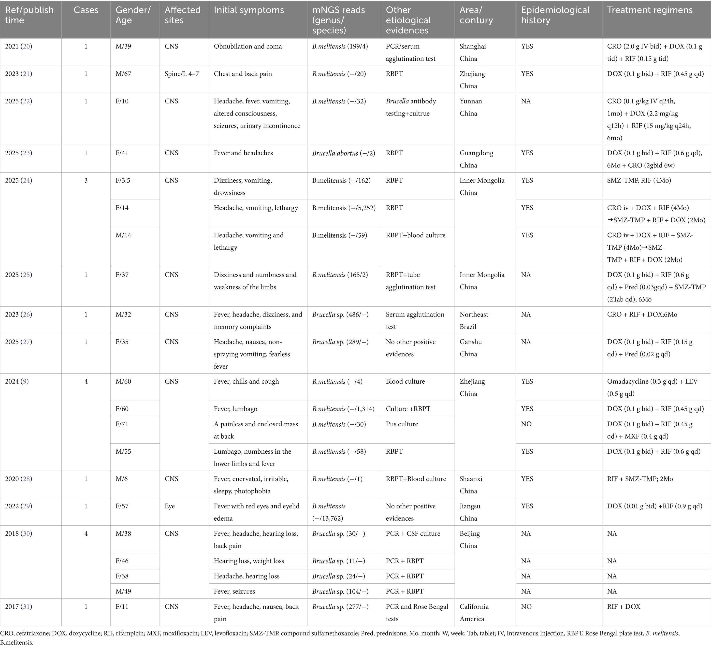 27. Yuan, B, Jiang, T, Han, J, and Wang, M. Neurobrucellosis with negative serological examination: a case report and literature review. Front Med. (2025) 12:1583891. doi: 10.3389/fmed.2025.1583891