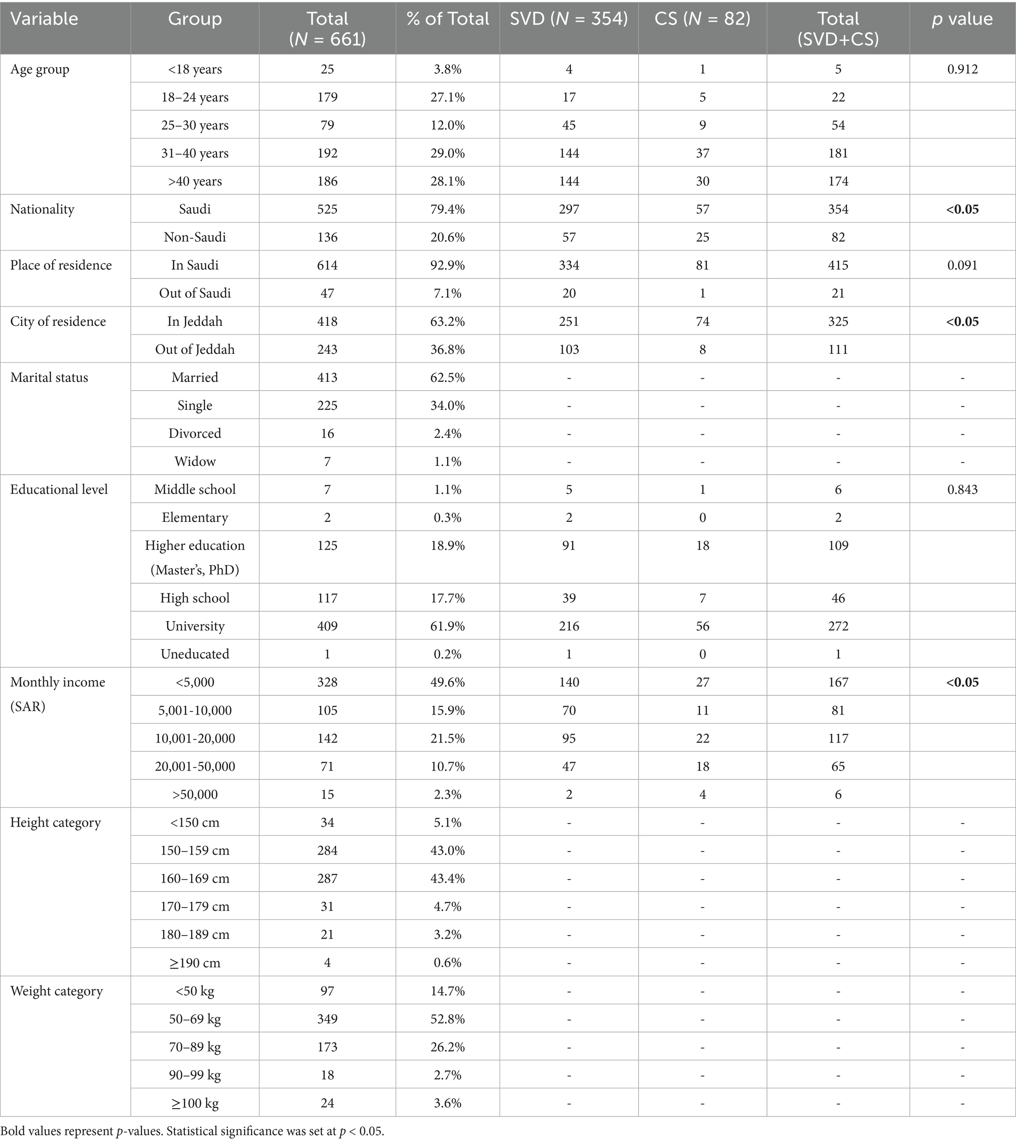We conducted a cross-sectional exploratory study in Jeddah, Saudi Arabia, following the Strengthening the Reporting of Observational Studies in Epidemiology (STROBE) guideline (18). The study utilized a multi-center approach across major public and private hospitals between January and December 2024 to investigate patients’ preferences for mode of delivery. We included both pregnant women (≥28 weeks gestation) and postpartum women (within 6 months of delivery) to capture preferences across the perinatal period. Exclusion criteria included multiple current pregnancies, known medical indications for CS (e.g., placenta previa, active genital herpes), fetal congenital anomalies, and women unable to provide informed consent. Participants were stratified by pregnancy status in analysis to account for potential differences in perspective. Data were collected using a structured, pre-validated questionnaire from a heterogeneous sample of 661 participants. The questionnaire was re-validated for our use through expert review by three obstetricians and a psychometrician, pilot testing with 30 women, and demonstrated good internal consistency (Cronbach’s alpha = 0.82). Participants were recruited during routine antenatal visits and through hospital maternity records. Enrolled women were asked their preference for delivery type during the post-delivery period. The questionnaire was distributed via secure WhatsApp links, with reminders sent at 2-week intervals to maximize response rate. To minimize response bias, we employed multiple recruitment strategies across different hospital settings, ensured anonymity of responses, and used standardized neutral language in all survey materials. The response rate was 71%, with no significant differences in basic demographics between responders and non-responders. The primary outcome, preference for mode of delivery, was assessed using the direct question with multiple response options.