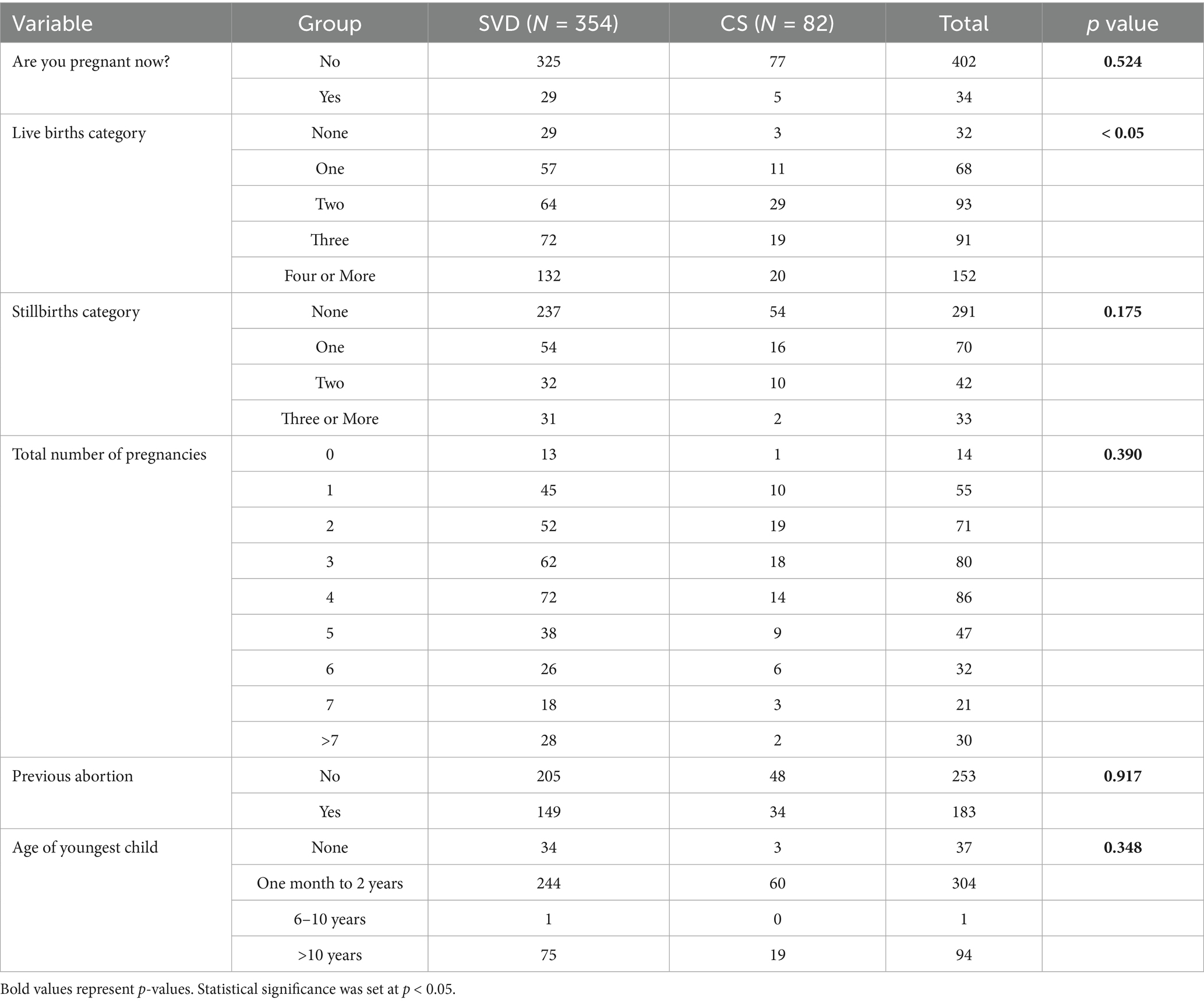 Further analysis of obstetric history, detailed in Table 2, revealed that the number of previous live births was a significant factor (p < 0.05). However, other obstetric factors such as current pregnancy status, history of stillbirth, total number of pregnancies, previous abortion, and the age of the youngest child did not demonstrate a significant influence on the choice between SVD and CS.