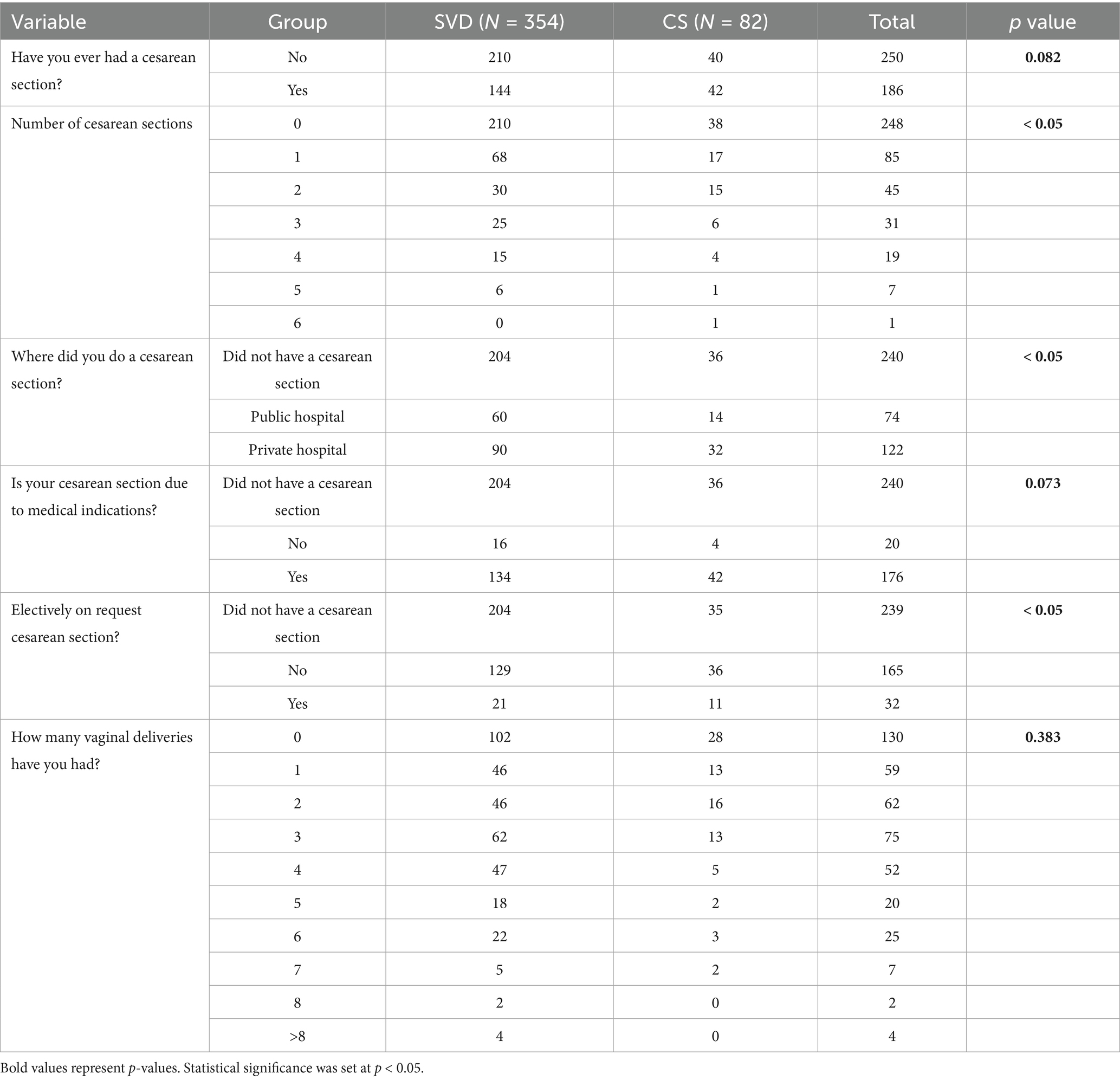 The relationship between CS history and participants’ preferred mode of delivery reveals several significant findings (Table 3). The number of previous CS strongly influenced delivery preferences, with participants who had no prior CS more likely to prefer SVD (p < 0.05). Additionally, those who had CSs in private hospitals were more inclined to choose CS for subsequent deliveries (p < 0.05). Elective CS on request also played a significant role, with participants who opted for elective CS more likely to continue preferring CS (p < 0.05). In contrast, factors such as whether the CS was due to medical indications and the number of previous SVD did not significantly affect delivery preferences (p > 0.05).