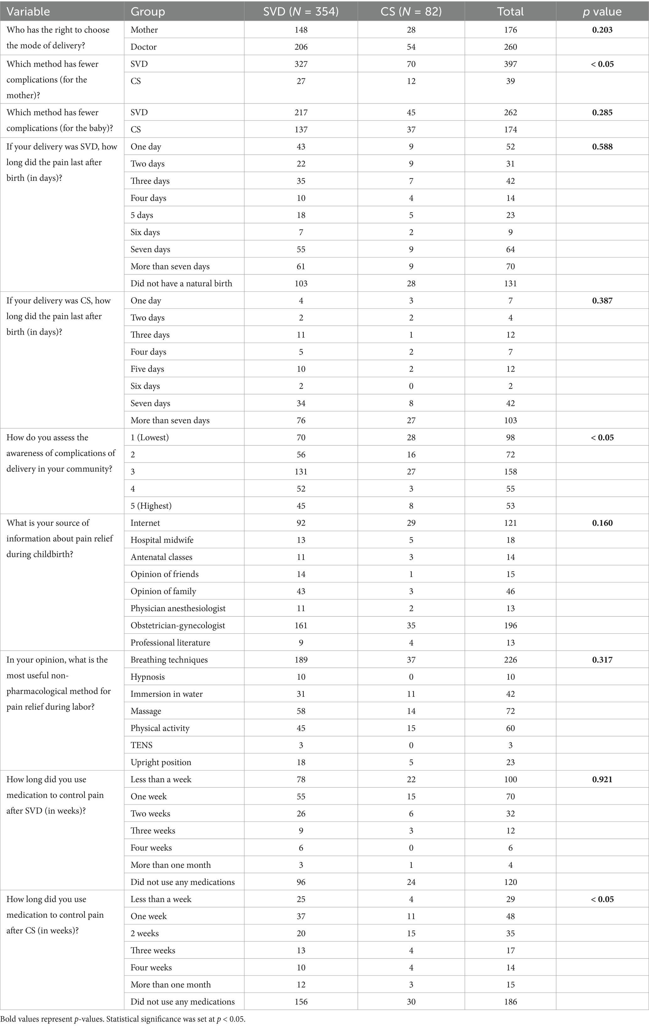 Regarding pain management after delivery, the duration of medication use was similar following SVD (p = 0.92), while after CS, there was a significant variation, with some participants requiring medication for more than a month (p < 0.05). These findings reflect the different perspectives and experiences related to SVD and CS, particularly in terms of perceived complications and pain management.