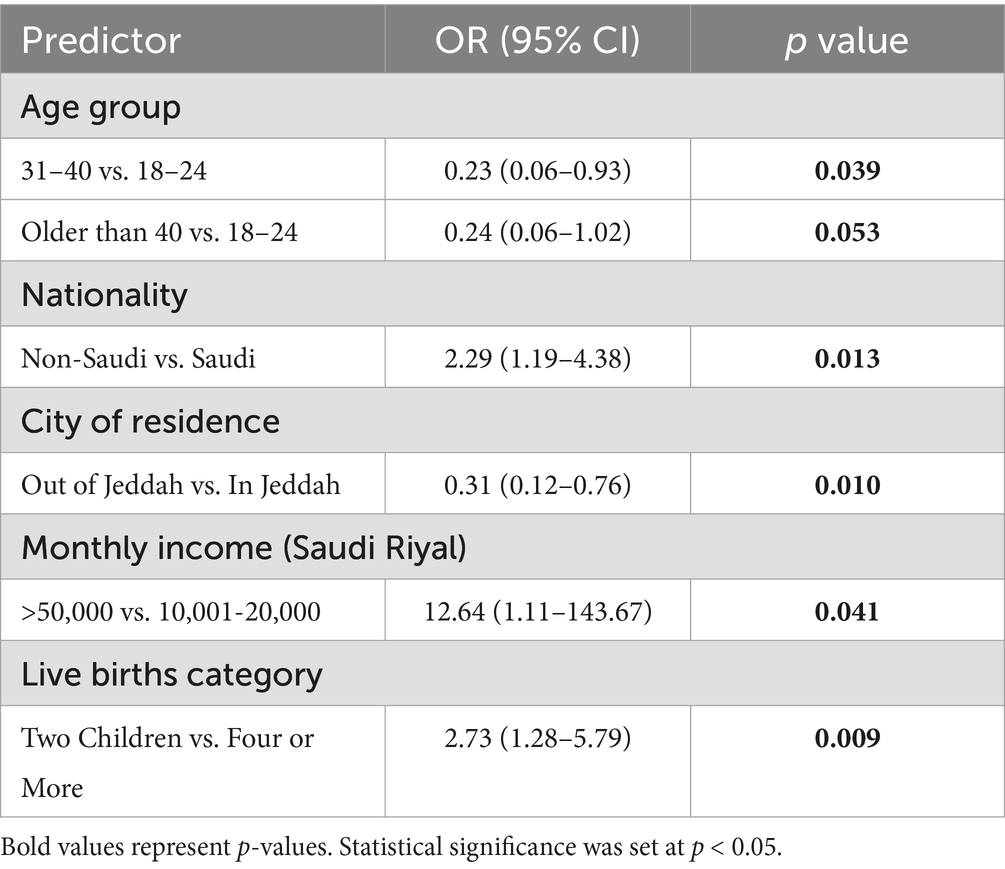 The association between participant characteristics and their preferred mode of delivery is presented in Table 1. In the bivariate analysis, several demographic factors showed significant associations with a preference for CS. These included non-Saudi nationality (p < 0.05), residence within Jeddah city (p < 0.05), and higher monthly income (p < 0.05). In contrast, age group (p = 0.912) and educational level (p = 0.843) were not significantly associated with delivery preference.