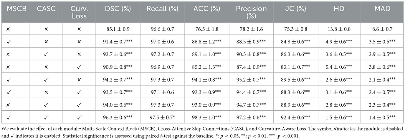 Combinations of any two modules yield further improvements, all statistically significant (p < 0.001). Notably, combining MSCB and CASC (without the loss term) achieves a Dice of 94.2%, while adding Curvature Loss to either of the blocks provides similar gains in both accuracy and boundary consistency. Incorporating all three modules leads to the best performance across all metrics, with a Dice score of 96.3%, Accuracy of 98.3%, and HD/MAD reduced to 1.5 and 1.4, respectively (all p < 0.001 compared to baseline). This clearly demonstrates the complementary nature of the three components in enhancing both region-wise segmentation and structural fidelity.