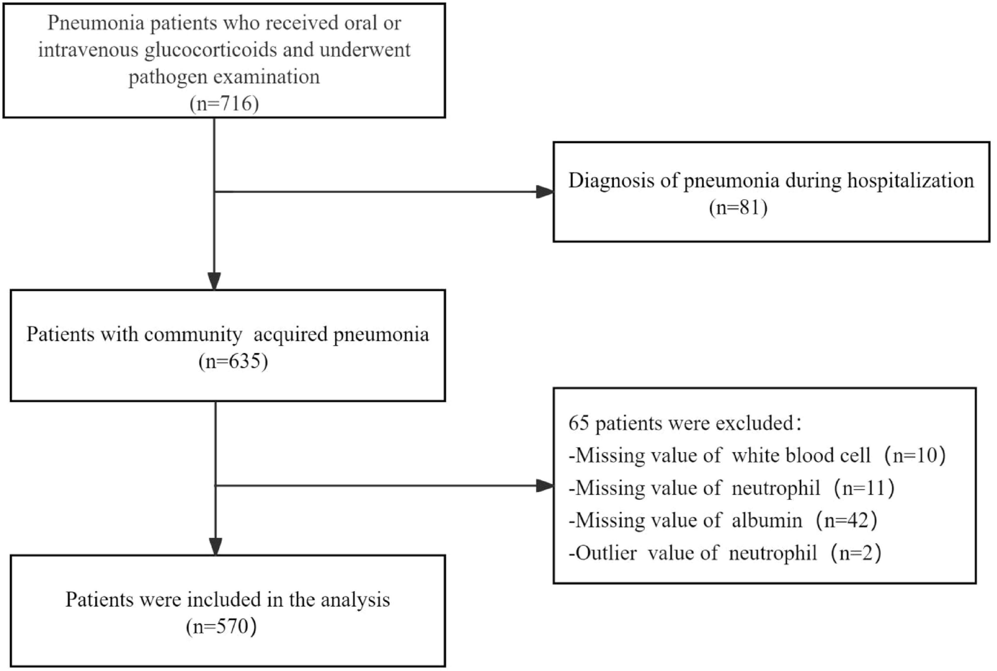 Flowchart illustrating the selection process for pneumonia patients. Out of 716 patients receiving glucocorticoids, 81 diagnosed during hospitalization were separated. From 635 with community-acquired pneumonia, 65 were excluded for missing or outlier lab values, leaving 570 included in the analysis.