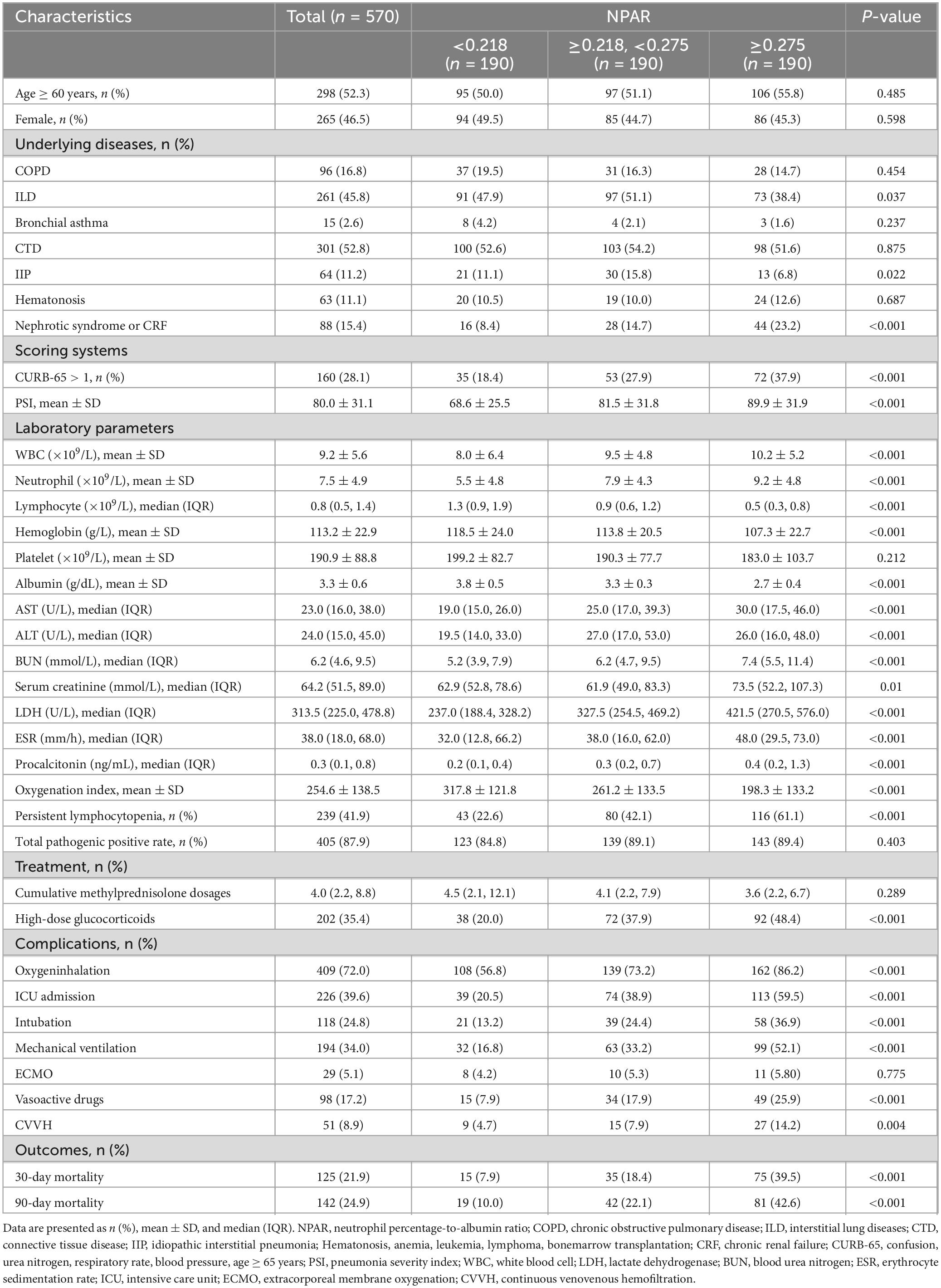 A total of 570 participants, who received glucocorticoids therapy and subsequently developed community acquired pneumonia, were ultimately included in this study (Figure 1). The baseline characteristics of the pneumonia patients stratified according to tertiles of NPAR, are summarized in Table 1. Each group included 190 patients. Among the study population, 298 (52.3%) were aged 60 years or older, and 265 (46.5%) were female. The most prevalent underlying diseases among those receiving glucocorticoid therapy were CTD (52.8%), ILD (45.8%), and COPD (16.8%). Patients in the highest NPAR tertile exhibited higher CURB-65 and PSI scores, and may need to be admitted to the ICU for treatment compared to those in the other tertiles. As NPAR increased, WBC, neutrophils, LDH, BUN, creatinine, and procalcitonin levels increased, whereas their oxygenation index, hemoglobin and albumin levels decreased. Furthermore, patients with a higher NPAR also experienced persistent lymphocytopenia, along with increased use of oxygen inhalation, intubation, ventilators, vasoactive drugs, and CVVH compared to those in the other tertiles. The 30-day and 90-day mortality rates were documented as 21.9% and 24.9%, respectively.