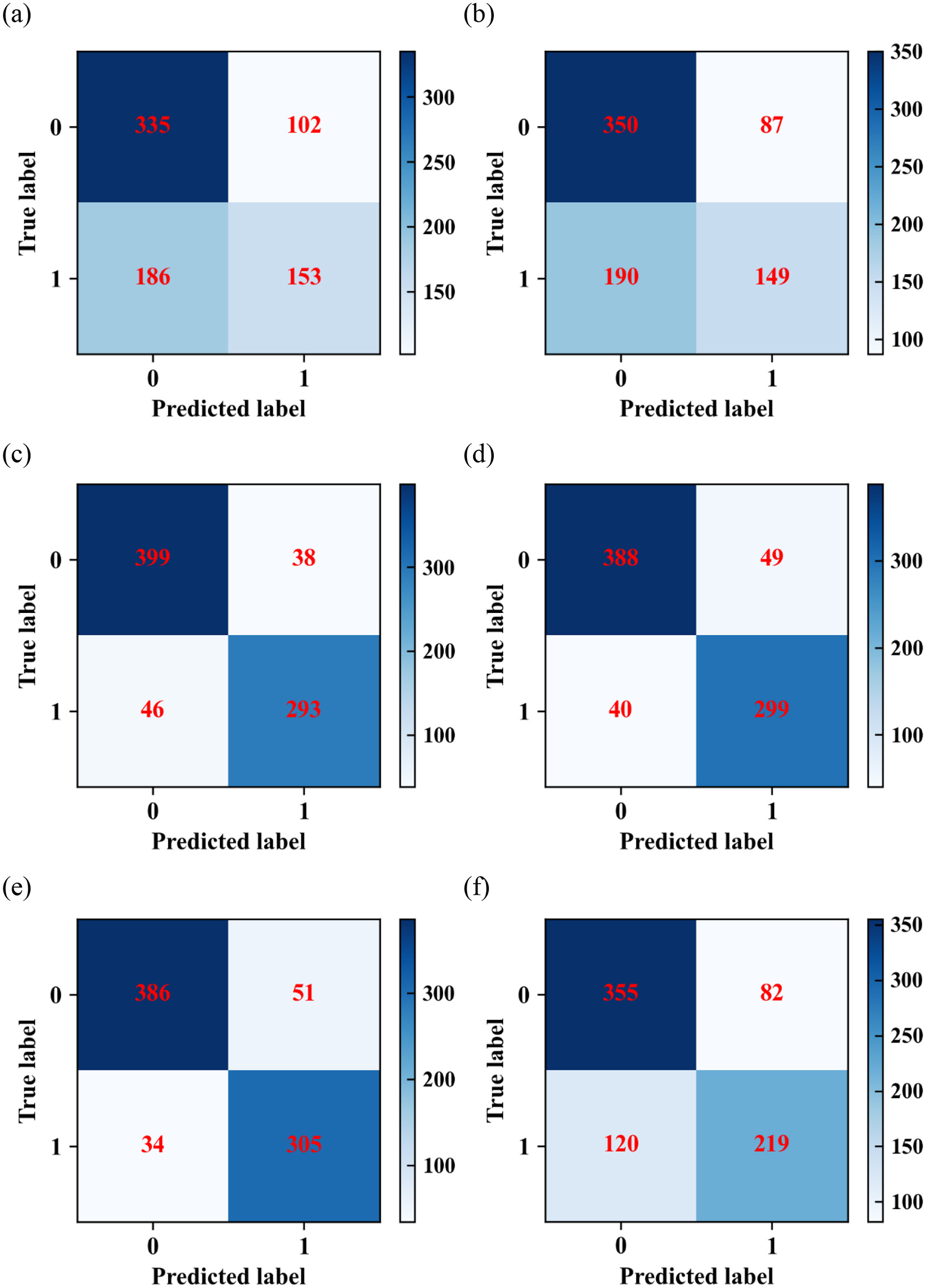 Confusion matrixes of (a) logistic regression; (b) SVM; (c) RF; (d) XGBoost; (e) LightGBM; and (f) AdaBoost algorithms.