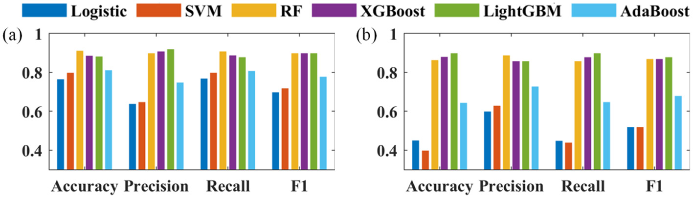 The performance of six machine learning models, logistic, SVM, RF, XGBoost, LightGBM, and AdaBoost, are evaluated based on the validation set using accuracy, precision, recall, and F1 scores, and the results are shown in Figure 3. The combined performance of RF, XGBoost, and LightGBM3 models are the best. Logistic regression, SVM, RF, XGBoost, LightGBM, AdaBoost 6 kinds of machine learning models performance of accuracy are respectively 0.77, 0.8, 0.91, 0.89, 0.88, 0.81, precisions are respectively 0.64, 0.65, 0.9, 0.91, 0.92, 0.75, recallings are respectively 0.77, 0.8, 0.91, 0.89, 0.88, 0.81, and F1 scores are respectively 0.7, 0.72, 0.9, 0.9, 0.9, 0.9, 0.78.