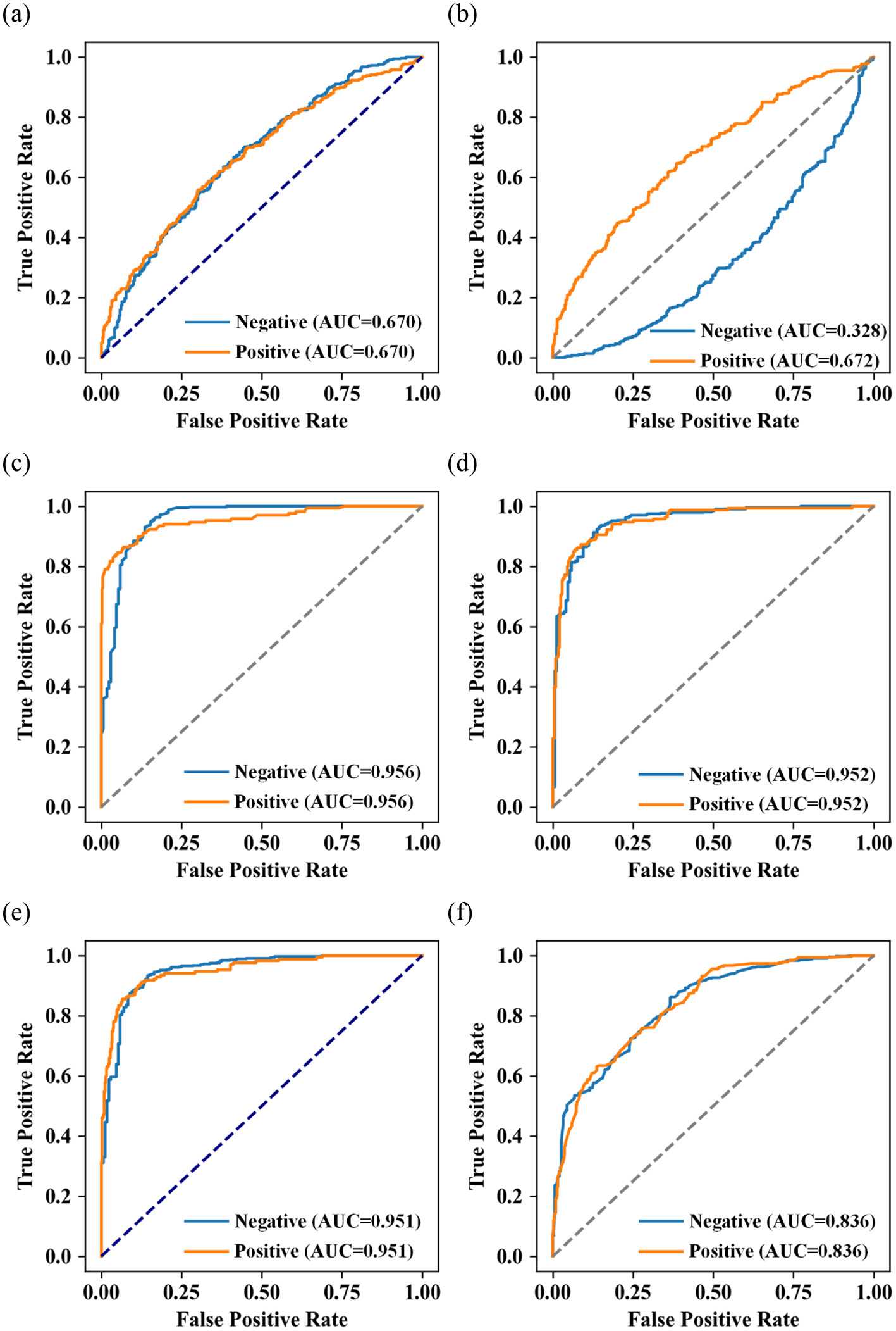 Receiver operating characteristic (ROC) of (a) logistic regression; (b) SVM; (c) RF; (d) XGBoost; (e) LightGBM; and (f) AdaBoost algorithms.