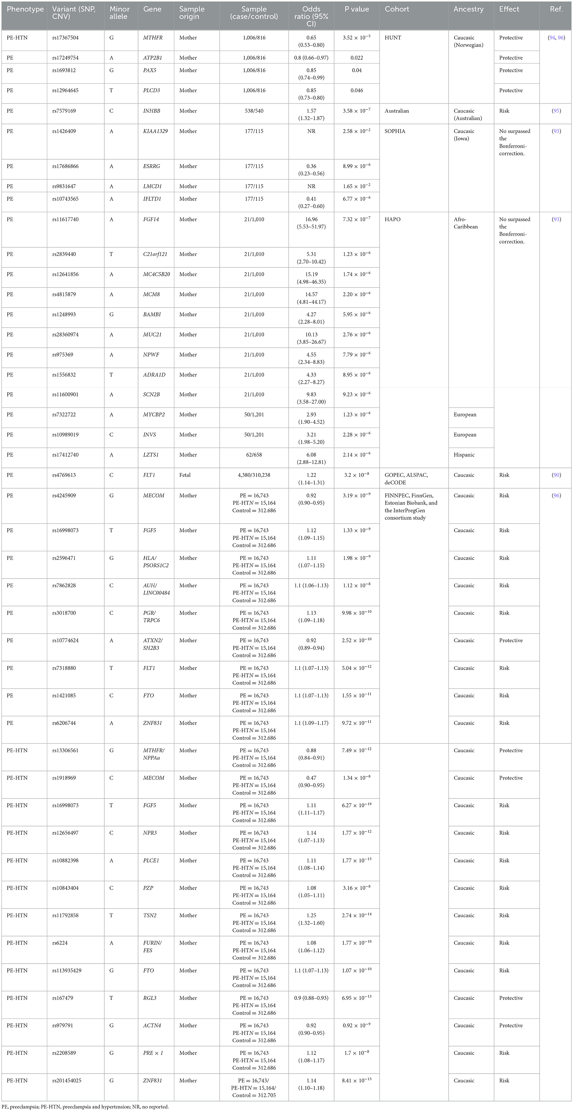 One of the pioneering studies and the largest GWAS on PE, which included 4,380 cases and 310,238 controls, was conducted by McGinnis and Steinthorsdottir and collaborators (90). They identified SNPs in linkage within the FLT1 gene on chromosome 13 (SNP rs4769613, risk allele C, p = 3.2 × 10−8). The C allele, present in 53% of the studied population, was estimated to confer a risk of PE (OR = 1.22, 95% CI (1.14–1.31) per allele), supporting the relationship of FLT1 with the development of PE. Additionally, two other SNPs of independent association with PE were identified: rs12050029 (A>G) (14% frequency) and rs149427560 (C>T) (6% frequency). SNPs rs4769613 (C>T) and rs12050029 (A>G) were located in placental enhancer regions near FLT1, suggesting that these variants may influence FLT1 expression by affecting gene transcription (90). This suggests that multiple causal variants in the fetal FLT1 locus contribute to disease risk. Interestingly, there was no difference in PE risk based on parental allele segregation, indicating that the increased risk is mediated by fetal gene expression, possibly in the placenta (90).