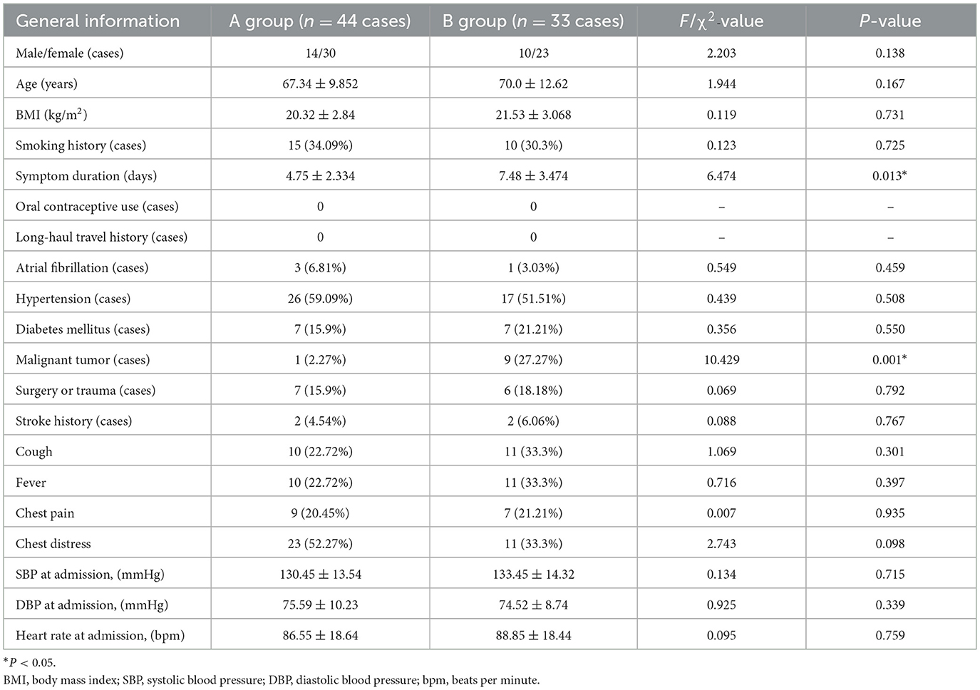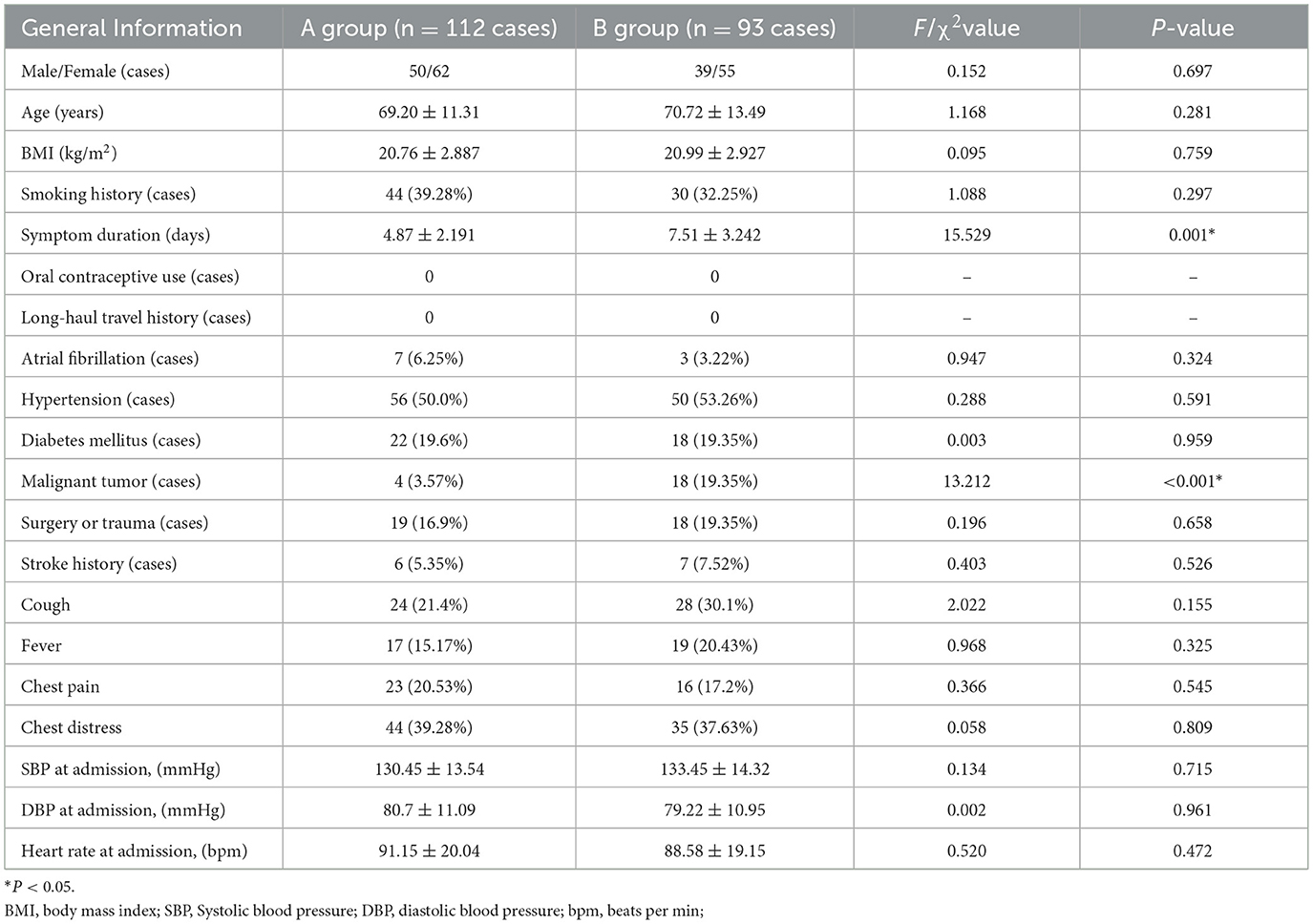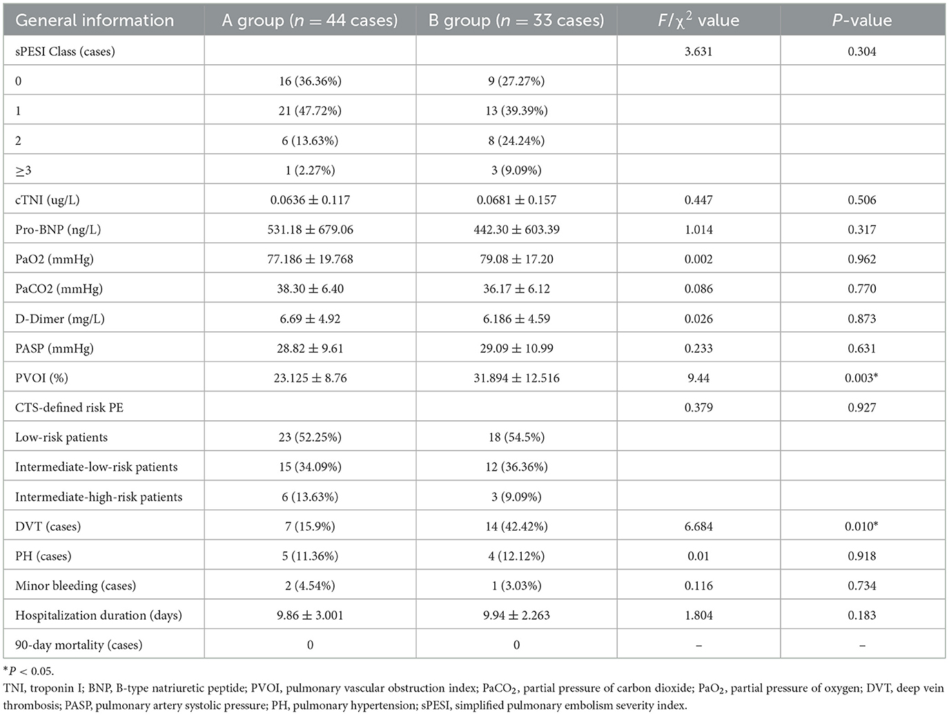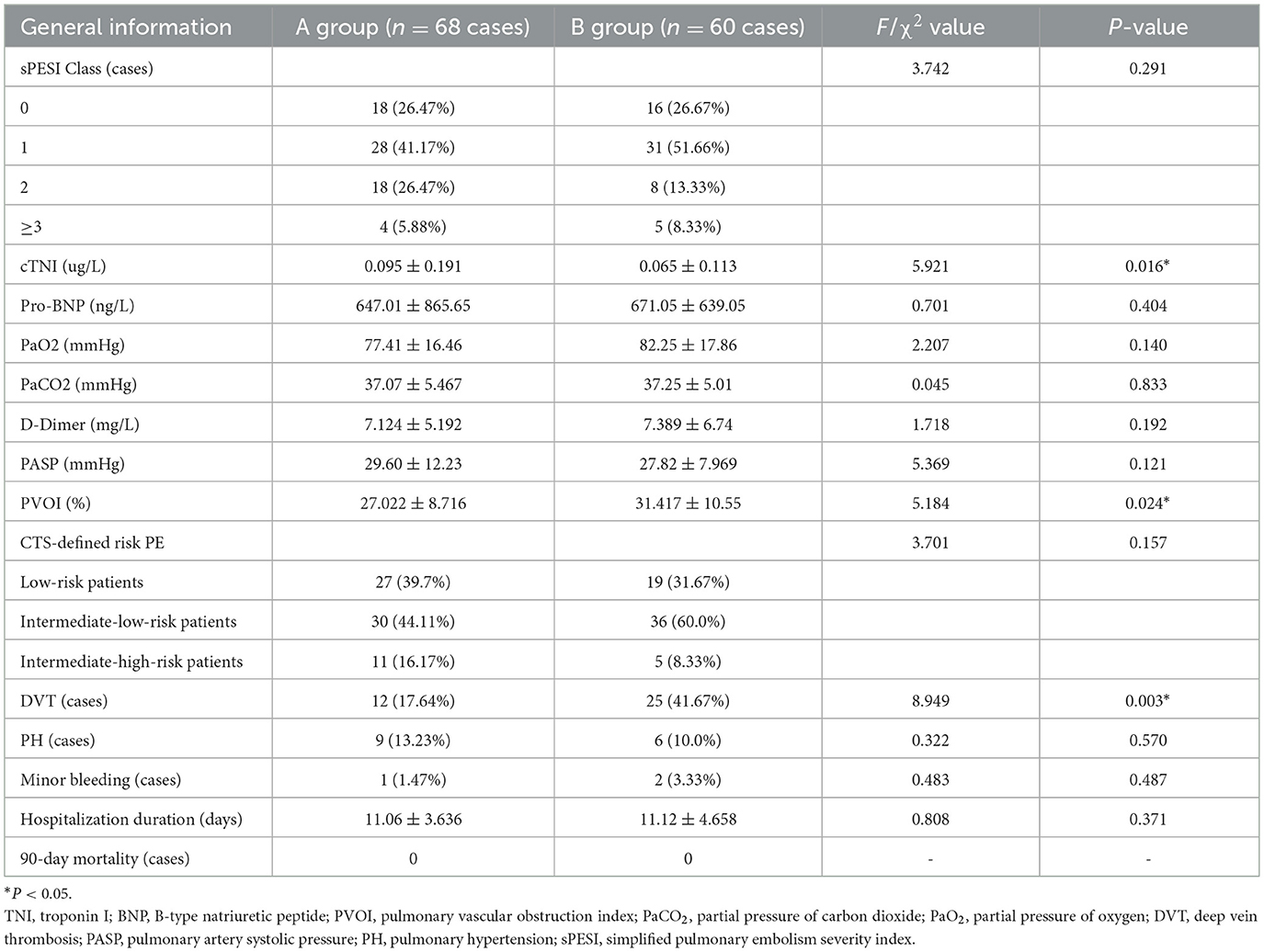 The following data were retrospectively collected and analyzed: gender, age, body mass index (BMI), smoking history, underlying diseases (hypertension, stroke, diabetes, recent fracture within the past 4 weeks, recent fixation or surgery, malignancy), major symptoms (chest pain, dyspnea, etc.), arterial blood gas analysis, plasma D-dimer (D-D), N-terminal pro-brain natriuretic peptide (NT-proBNP), cardiac troponin I (cTNI), electrocardiographic findings, pulmonary artery systolic pressure (PASP; measured via echocardiography), lower extremity venous ultrasound findings, thrombus location, pulmonary hypertension (defined as PASP > 40 mmHg), pulmonary vascular obstruction index (PAOI) (14), CSC-defined PE risk categories (low risk, intermediate-low risk, intermediate-high risk, high risk), simplified Pulmonary Embolism Severity Index (sPESI; scores of 0, 1, 2, ≥3) (15), bleeding manifestations, treatment regimens, and outcomes.