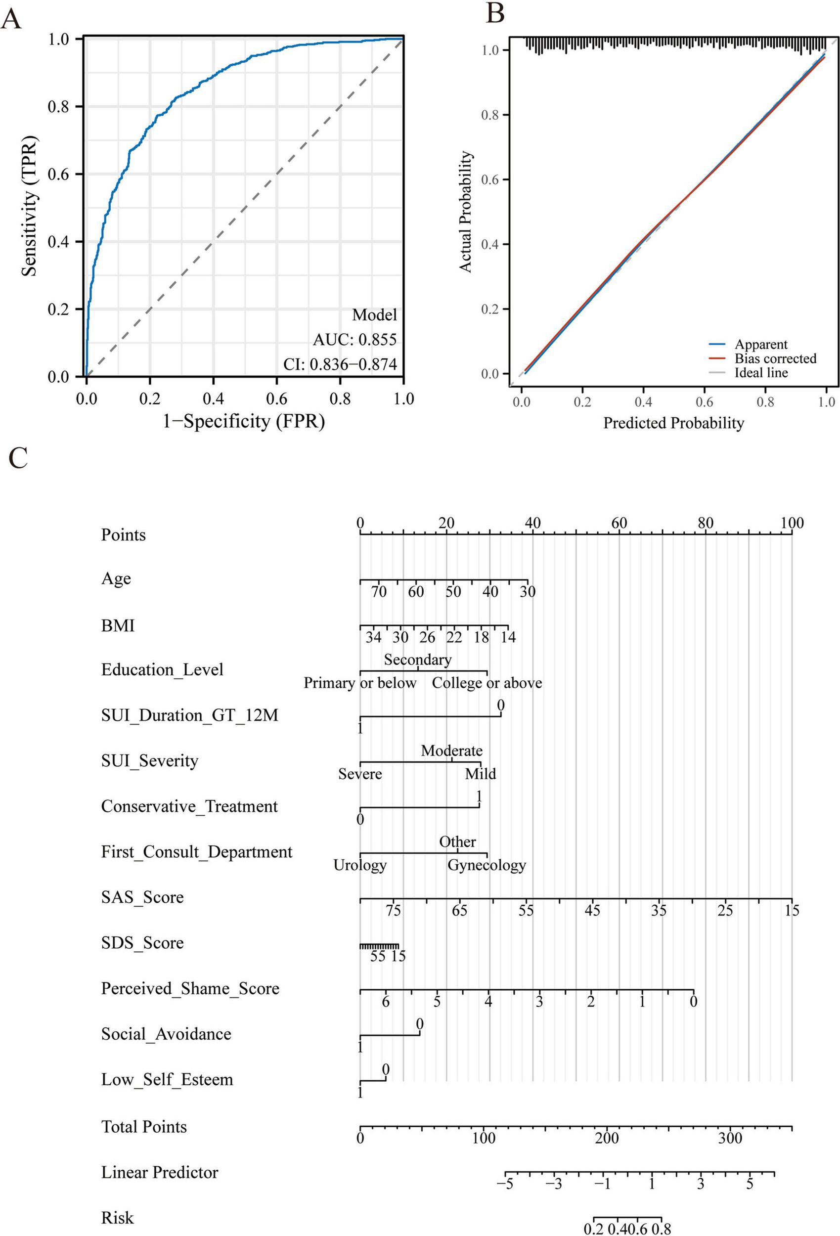 Model performance and predictive nomogram for delayed medical help-seeking in women with stress urinary incontinence (SUI). (A) Receiver operating characteristic (ROC) curve of the final multivariable logistic regression model, demonstrating good discrimination with an AUC of 0.855 (95% CI: 0.836–0.874). (B) Calibration plot of the model, showing close agreement between predicted probabilities and observed outcomes after 1,000 bootstrap resamples. The apparent curve (blue) and bias-corrected curve (red) are shown against the ideal 45° line (black). (C) Nomogram developed from the final model for individualized risk estimation. Each predictor is assigned a point value; the sum of points corresponds to the probability of delayed medical consultation, as indicated at the bottom risk scale.