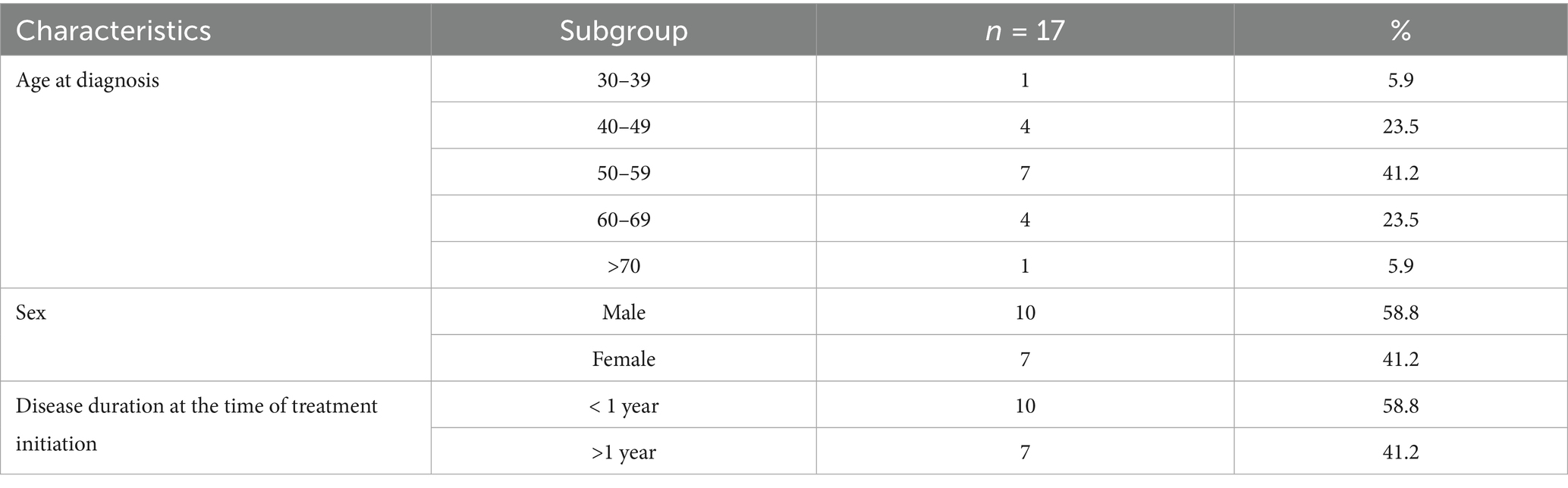 At the time of treatment initiation, 10 patients (58.8%) had a disease duration of less than 1 year, while 7 patients (41.2%) had been diagnosed for more than 1 year.