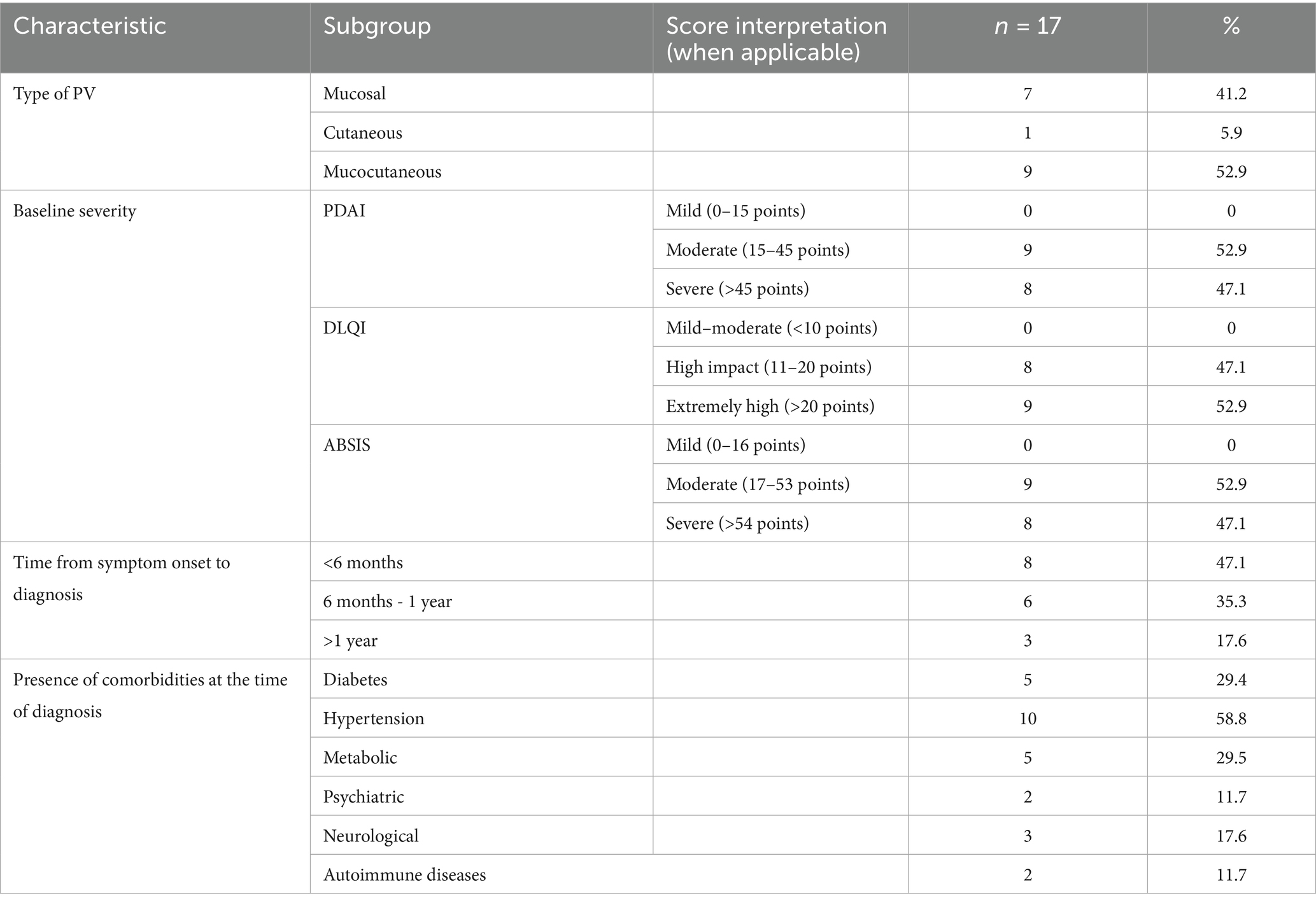 Table 2 summarizes the baseline clinical characteristics of the cohort. Among the 17 patients, 41.2% (n = 7/17) had mucosal PV, 5.9% (n = 1/17) had cutaneous PV, and 52.9% (n = 9/17) presented with the mucocutaneous type. At baseline, no patients had mild disease by PDAI, DLQI, or ABSIS. By PDAI, 52.9% (n = 9/17) had moderate disease severity, and 47.1% (n = 8/17) had severe disease. The DLQI score showed no patients with mild-to-moderate impact, while 47.1% (n = 8/17) had high impact and 52.9% (n = 9/17) had extremely high impact. According to the ABSIS, none were classified as mild, 52.9% (n = 9/17) were moderate, and 47.1% (n = 8/17) were severe. Regarding diagnostic delay, 47.1% (n = 8/17) were diagnosed within 6 months of symptom onset, 35.3% (n = 6/17) between 6 months and 1 year, and 17.6% (n = 3/17) after more than 1 year.