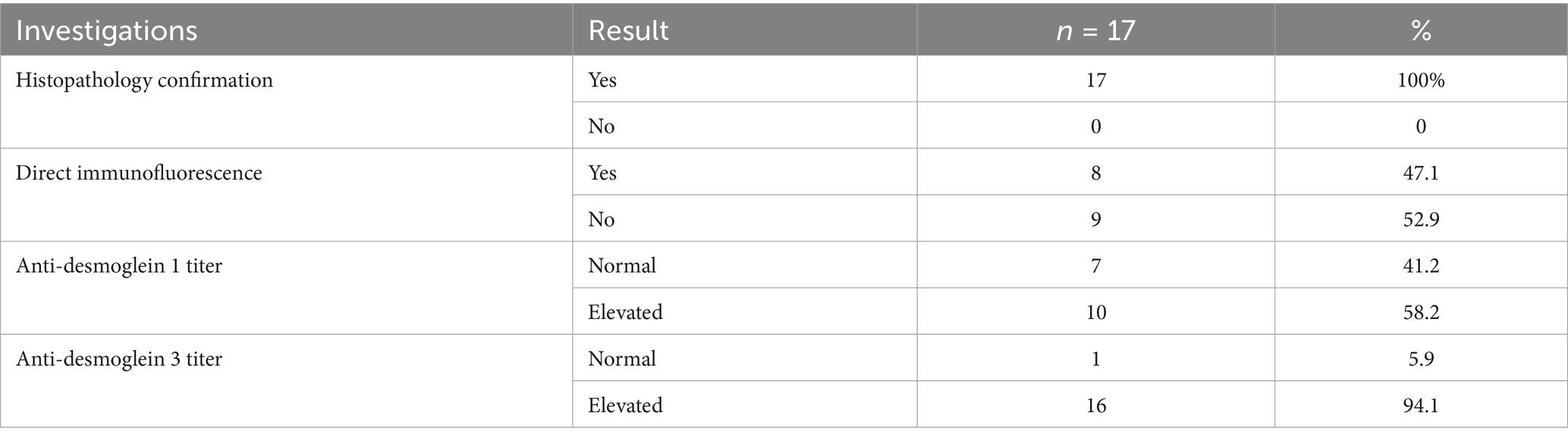 Table 3 presents the histopathological and immunological findings of the cohort. Histopathological confirmation was obtained in all patients (100%, n = 17/17). DIF testing was performed in 47.1% (n = 8/17) of cases, while 52.9% (n = 9/17) were diagnosed without it. Regarding serological markers, elevated anti-Dsg1 titers were found in 58.2% (n = 10/17) of patients, while 41.2% (n = 7/17) had normal levels. Anti-Dsg 3 titers were elevated in 94.1% (n = 16/17) of patients, with only 5.9% (n = 1/17) showing normal values.