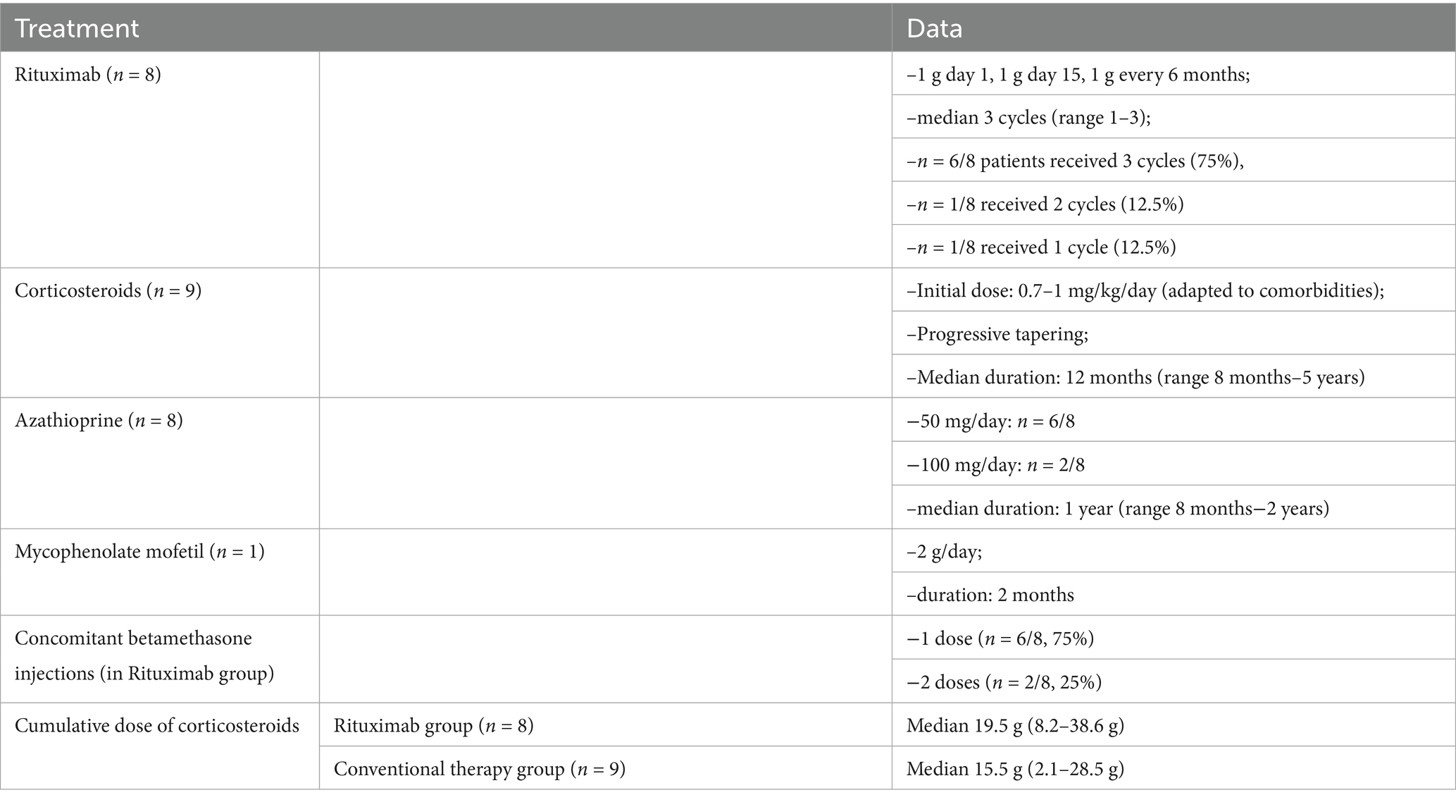 Results: Eight patients received rituximab and nine received conventional therapy. Rituximab led to faster disease control, with 100% of patients achieving control within 12 months compared with 55.6% in the conventional group. Complete remission at last follow-up was higher in the rituximab group (75%) than in the conventional group (44.4%). No relapses occurred in rituximab-treated patients during follow-up, whereas all patients treated conventionally experienced relapses (34 episodes in total). The cumulative corticosteroid dose was higher in the rituximab group (median 19.5 g vs. 15.5 g) due to prior exposure before therapy switch. Adverse events differed by treatment: rituximab was associated primarily with early infusion-related reactions and infections, while conventional therapy caused steroid-related toxicities.