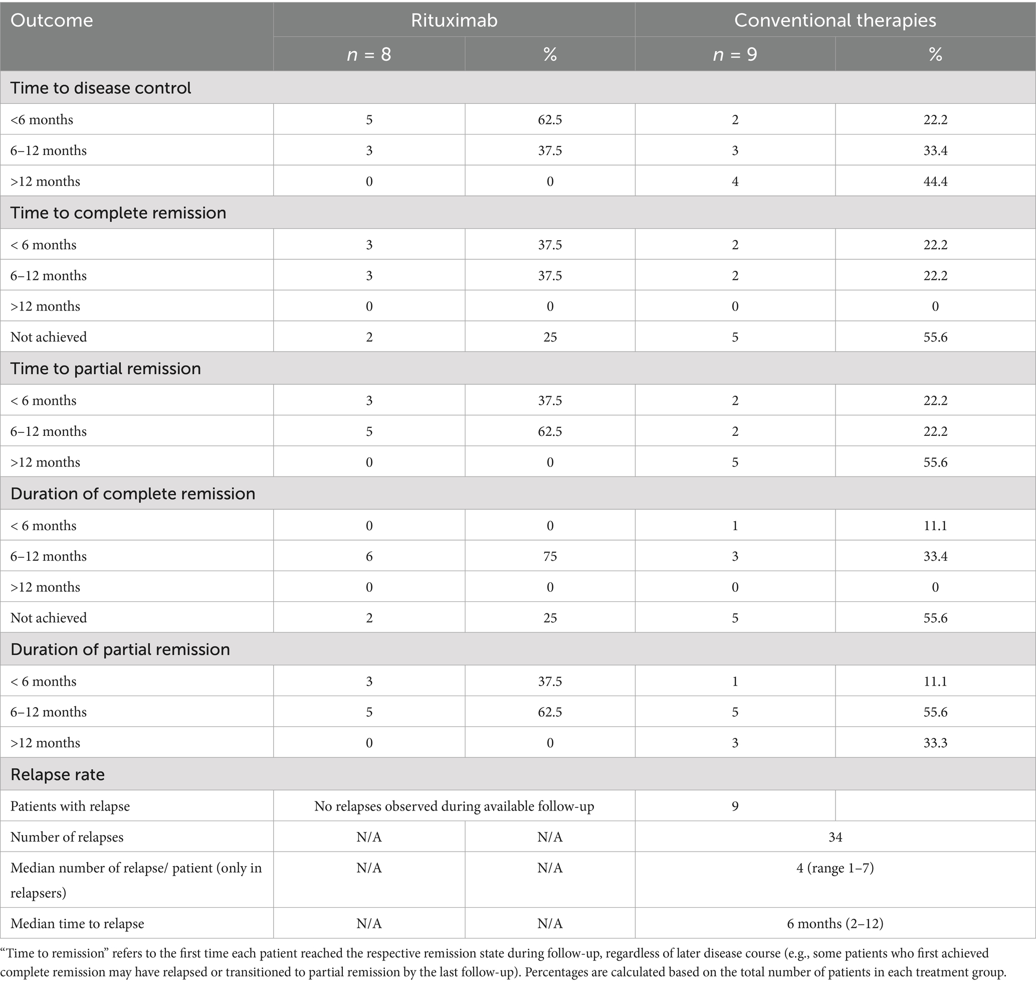 In this small cohort, rituximab-treated patients reached disease control within 12 months, while conventional therapy patients more often required longer. No relapses were documented in the rituximab group during available follow-up, whereas relapses were observed in all patients on conventional therapy. The median number of relapses among relapsing patients was 4 (range 1–7), and the median time to first relapse was 6 months (range 2–12 months).